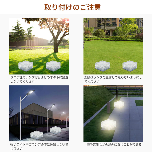 ・電源や配線が不要なため、直射日光の当たる場所に長時間LEDランプを置いて充電します。夜間は自動的にオンになり、日中は自動的にオフになります。