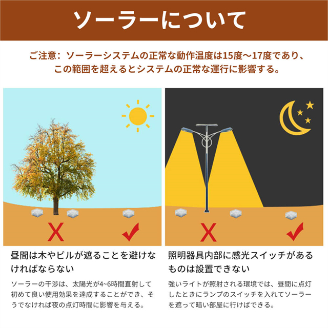 2.ガラス室、監視エリア、その他の照明時間が短いエリアへの設置には適していません(直射日光の当たる場所に6時間以上設置する必要があります)。