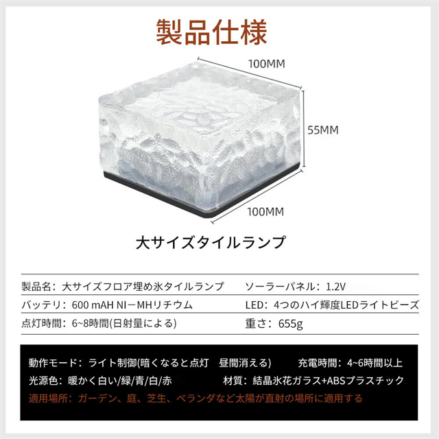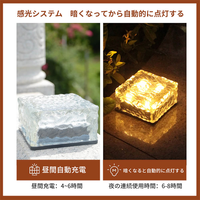 ・内蔵のソーラーパネルは、日中は直射日光の下で自動的に充電され、日中に完全に充電された後、夜間に6-8時間の照明を提供できます。