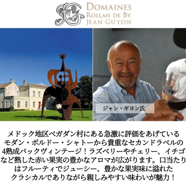 メドック地区ベガダン村にある急激に評価をあげているモダン・ボルドー・シャトーから貴重なセカンドラベルの4熟成バックヴィンテージ!ラズベリーやチェリー、イチゴなど熟した赤い果実の豊かなアロマが広がります。口当たりはフルーティでジューシー、豊かな果実味に溢れたクラシカルでありながら親しみやすい味わいが魅力!