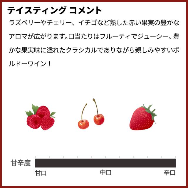 ![]() ■ぶどう品種:メルロ65%、カベルネ・ソーヴィニヨン25%、カベルネ・フラン10% ■発酵・熟成:ステンレスタンクとコンクリートタンクで4-5週間発酵、マロラクティック発酵と熟成 コンサルタントにはイタリア人著名醸造家リカルド・コテルラとボルドー大学ワイン研究の権威アラン・レイノーを招集しています。毎年評価誌で高い評価を得る程の品質の高さに対して価格が落ち着いているため、高い人気を誇る、メドックを代表するシャトーです。 ラズベリーやチェリー、イチゴなど熟した赤い果実の豊かなアロマが広がります。口当たりはフルーティでジューシー、豊かな果実味に溢れたクラシカルでありながら親しみやすいボルドーワインです。 |