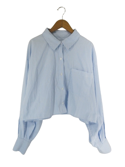 【中古】ムルーア MURUA シャツ 長袖 ショート 丈 ストライプ サイズF 水色 白 QQQ レディース
