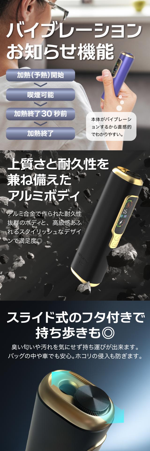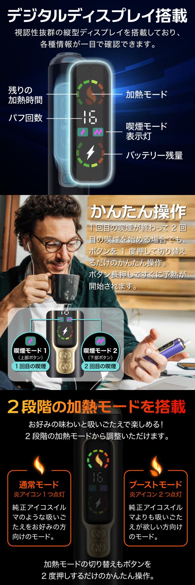 最大30回の連続使用※ができる3200mAhの大容量バッテリーと2段階の加熱温度調整やバッテリー残量、残りパフ回数、加熱時間が確認できる視認性抜群の縦型デジタルディスプレイも搭載しており、機能性とコストパフォーマンスに優れた最高級のハイスペックモデルとなっております。