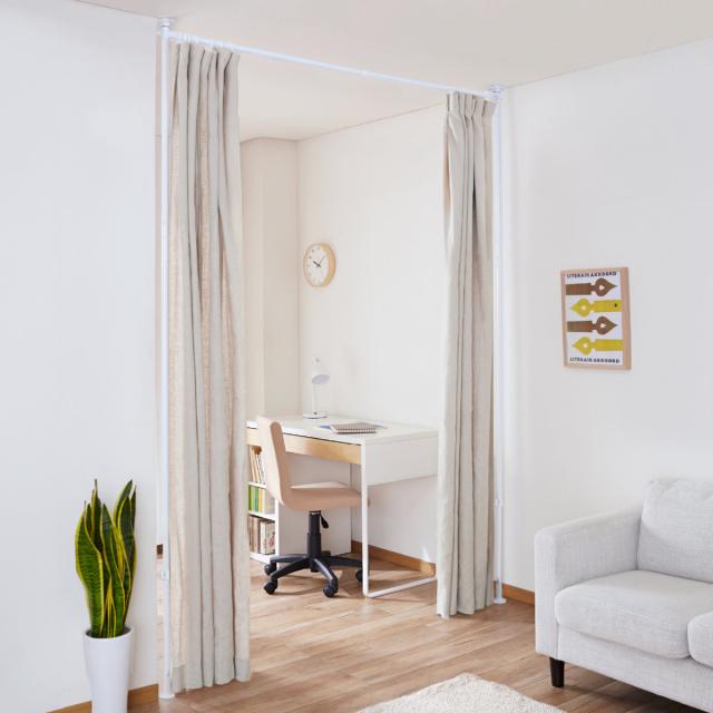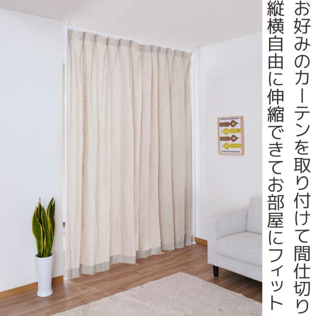 リビングや子ども部屋などを間仕切ることができるカーテンポールです。壁や天井に穴を開けるなどの工事が不要の突っ張り式で、賃貸のお部屋にもおすすめです。縦にも横にも伸縮するので、お部屋にフィットします。