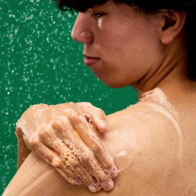 ボトルを軽く振り、適量をスポンジやタオルまたは両手でよく泡立てます。そして、お肌や髪の汚れとなじませてから、きれいに洗い流してください。