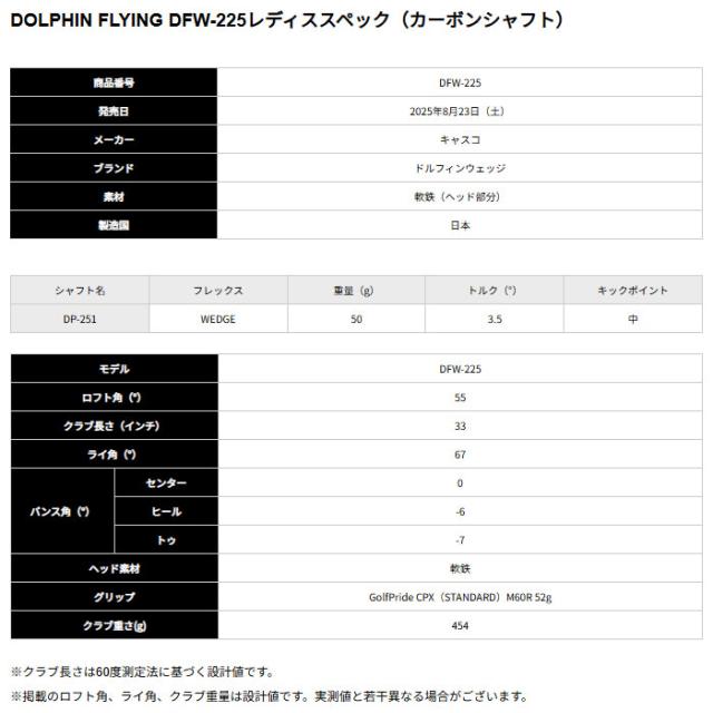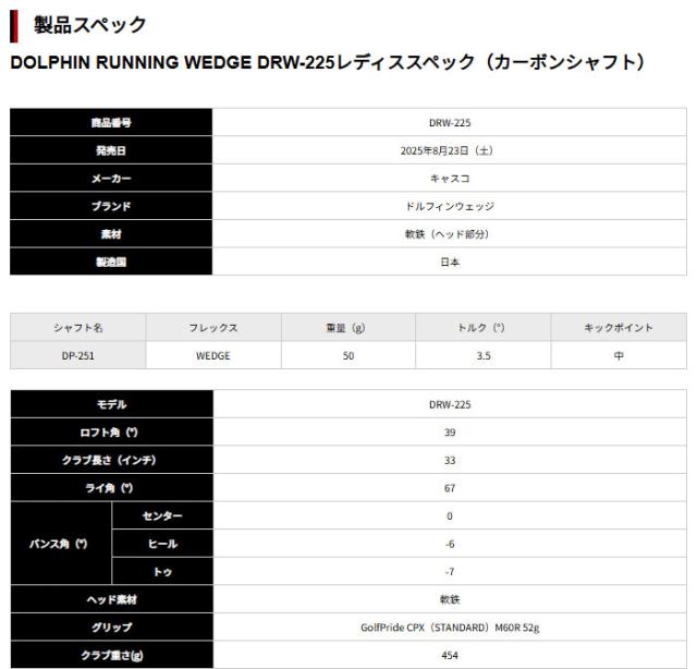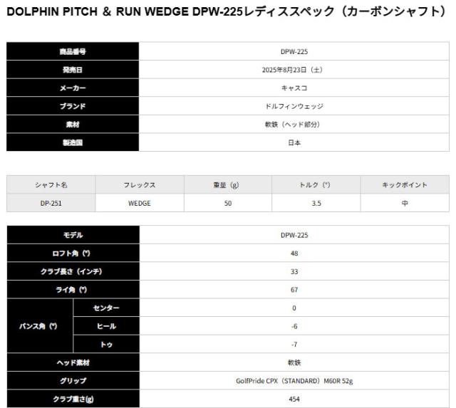 【レディース】キャスコ ドルフィン ウェッジ レディススペック DOLPHIN WEDGE DRW-225/DPW-225/DFW-225 DP-251 カーボンシャフト 33インチ 2025年モデル kasco GOLF[DOLPHIN RUNNING WEDGE][DOLPHIN Pitch & Run WEDGE][DOLPHIN Flying WEDGE]