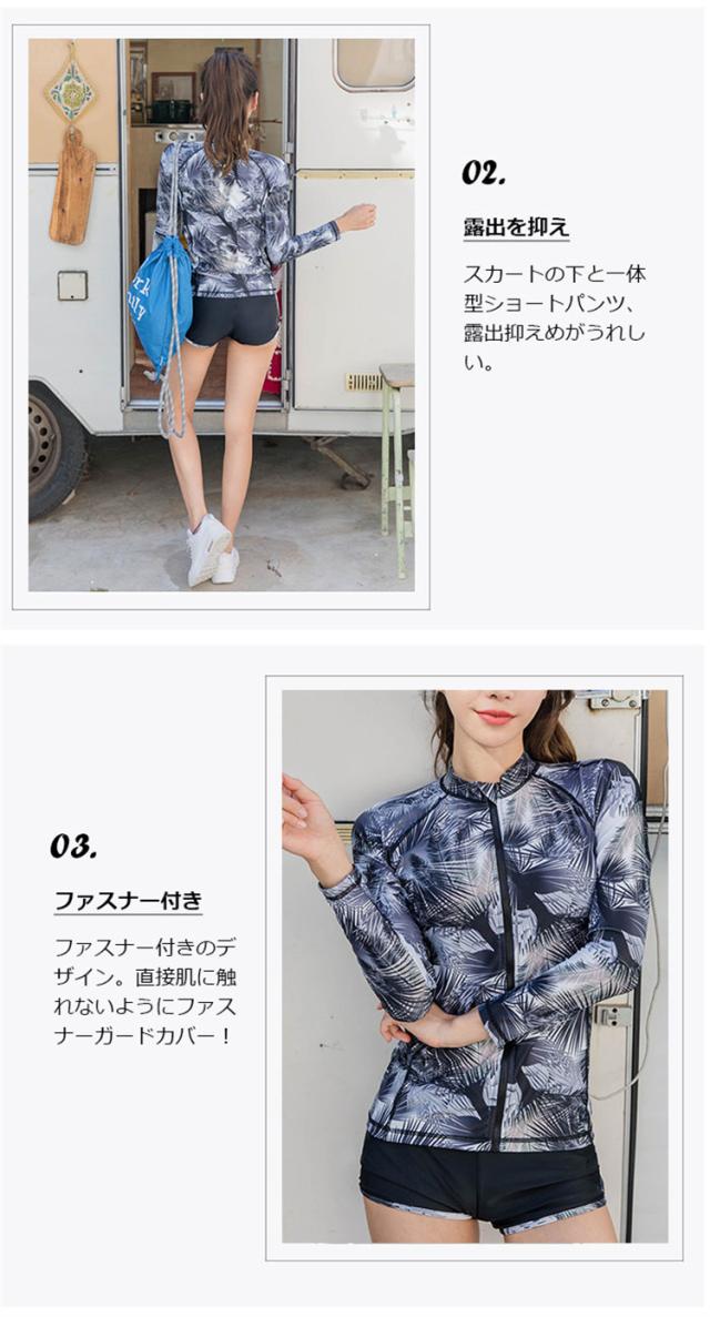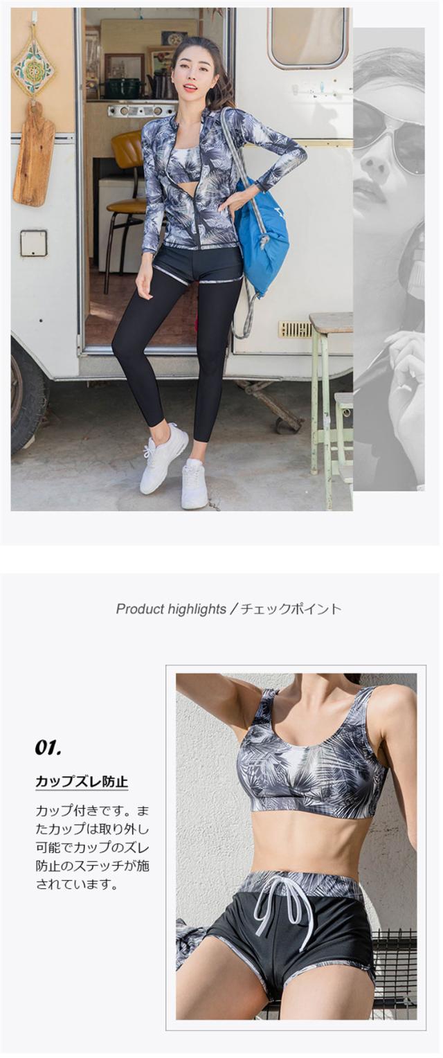 パッド付き/取り外し可能、ストレスフリーのノンワイヤータンキニブラ(肩ひも調節不可/取り外し不可)、ハイウエストパンツで小腹もカバー、ラッシュガードにはファスナーガードデザインを施し、顎や顔、首元の擦れを防止し、お肌を守ります。不快感なく脱着しやすいのとともに、スポーツ中に髪などが絡まる心配もなし!