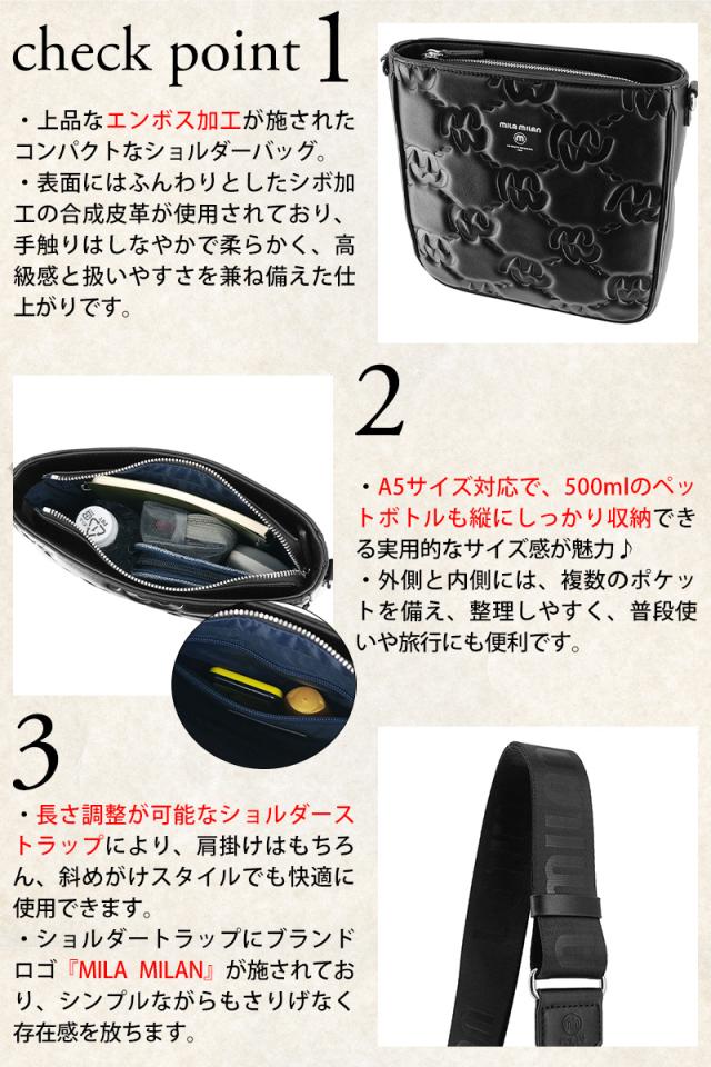 【最大300円OFF】モールクーポン対象! ミラ・ミラン バッグ ショルダーバッグ 斜めがけバッグ たて型 mila milan カリーナ ショルダー A5 263102 メンズ レディース 黒 白 緑 ポイント10倍 送料無料 誕生日プレゼント ギフト ラッピング無料 【正規代理店】