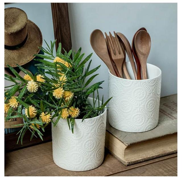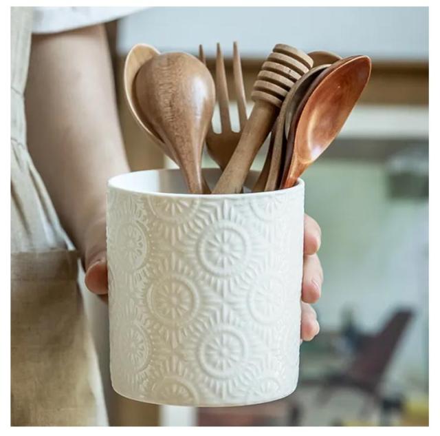 キッチンツールスタンド 陶器 カトラリースタンド 筒 円柱 重厚感 花柄 おしゃれ キッチンツール収納 箸立て カトラリー入れ ツールスタンド おたま レードル フライ返し 菜箸 入れ 調理グッズ 調理道具 収納 キッチン収納 かわいい 白 ホワイト