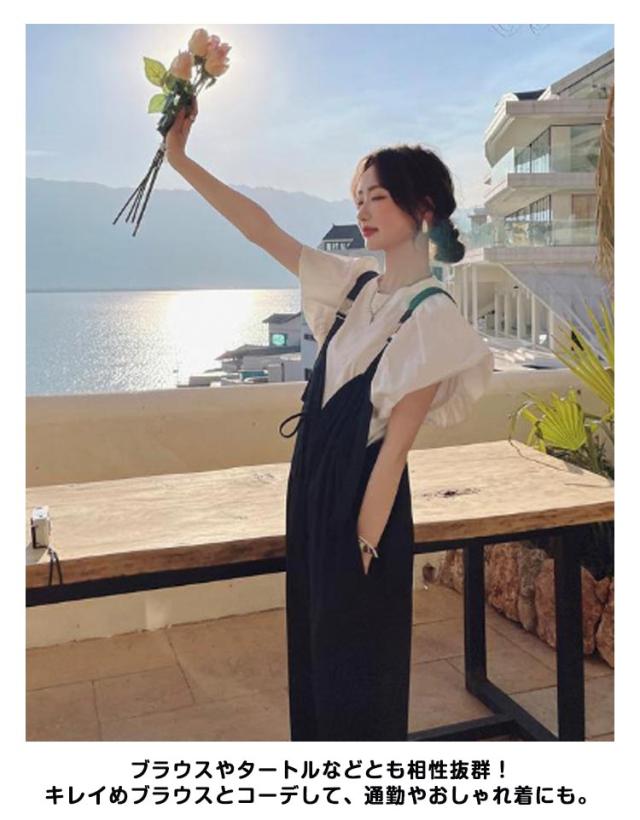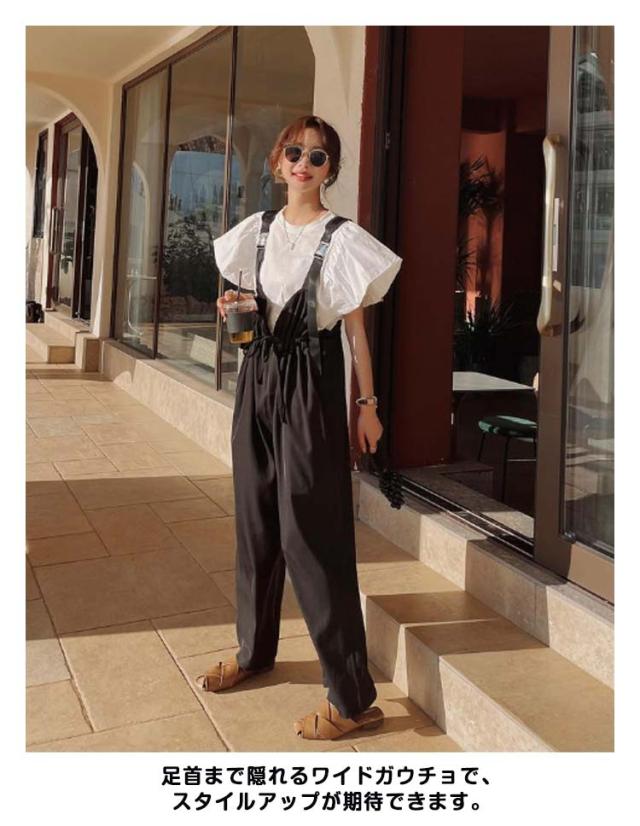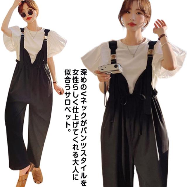 サロペット パンツ レディース オールインワン ワイドパンツ ガウチョパンツ サロペットパンツ オーバーオール ロング ノースリーブ Vネック サロペット ウエストゴム カシュクール風 ゆったり ジャンプスーツ 30代 40代