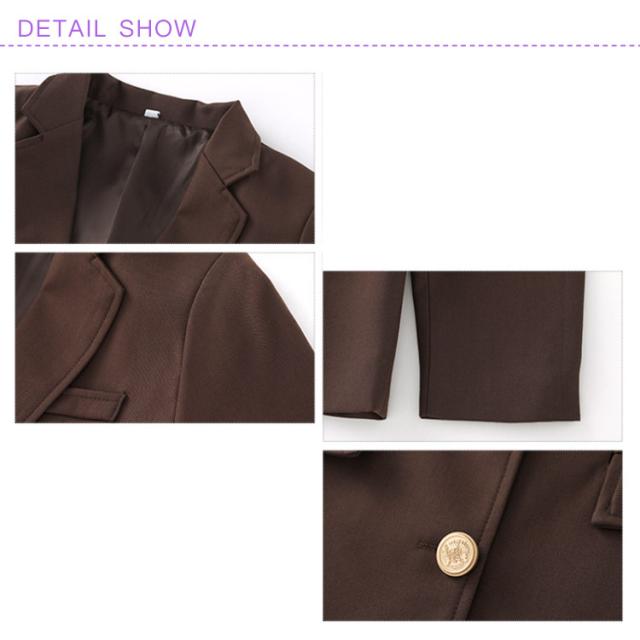 | スクールシーンに欠かせないブレザー。 ポリエステルを使用しており、柔らかくて肌触りが良く、通気性も良いジャケットです。 袖口にゴールドのボタンが二つ飾られ、清楚で上品な印象を演出します。 Vゾーンをすっきり見せる襟デザインとなっています。 気になるヒップをカバーしつつ、ウエストシェイプラインのジャケットは、細身効果も抜群。 オールシーズン使うことができ、着やすく合わせやすいので普段着として大活躍しそうです。 きちんと感がありながらも堅苦しくないスタイルは着回し力抜群◎ 入学式、学園祭、文化祭、結婚式、発表会など、フォーマルなシーンにピッタリなフォーマルスーツです。 | |