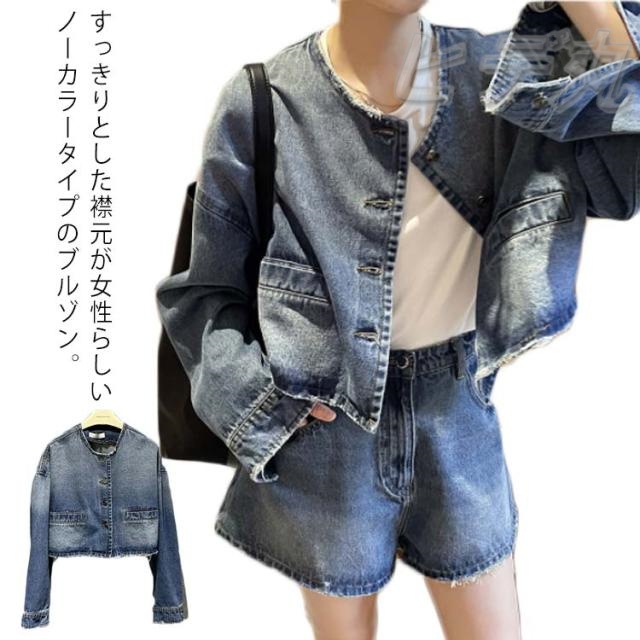 デニム ジャケット ノーカラー レディース デニムジャケット ノーカラージャケット ショート丈 長袖 薄手 裏地なし ゆったり オーバーサイズ 春 秋 アウター ブルゾン 羽織り ライトアウター ポケット付き カジュアル おしゃれ 【送料無料】