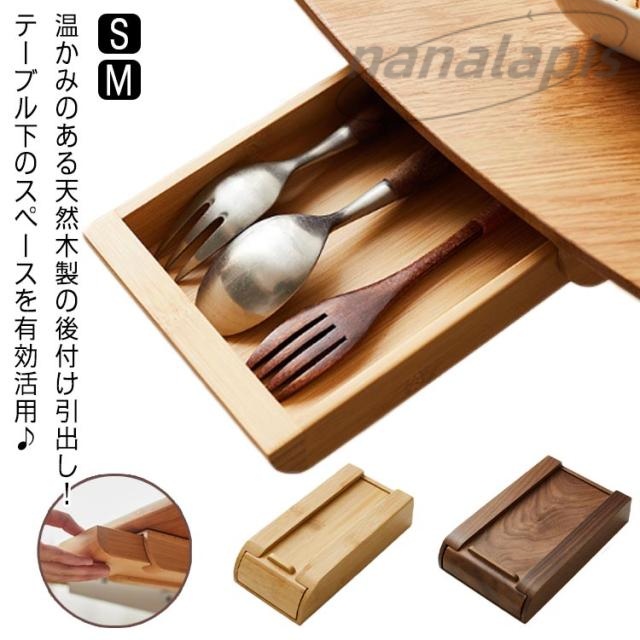 | 温かみのある天然木製の後付け引出し!テーブル下のスペースを有効活用♪ テーブルの上に散らかりがちな小物類をすっきりまとめておける、スライド収納タイプ。 粘着シールで貼るだけの簡単仕様! オフィス用品、カトラリーなどのお食事グッズ、文房具、お薬や印鑑など、頻繁に出し入れする小物類の収納にぴったり! デスクはもちろんダイニングテーブルやキッチン、クローゼットなどのスキマを活かして収納スペースが拡張できます。 スリムな設計なので座って作業をするときにも邪魔にならず、さっと引き出してすぐに取り出せるので作業効率も大幅にアップ。 天然木のナチュラルな風合いが、どんなお部屋にも馴染みます。 | |