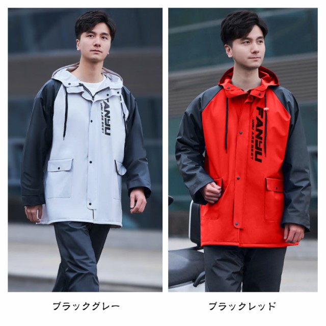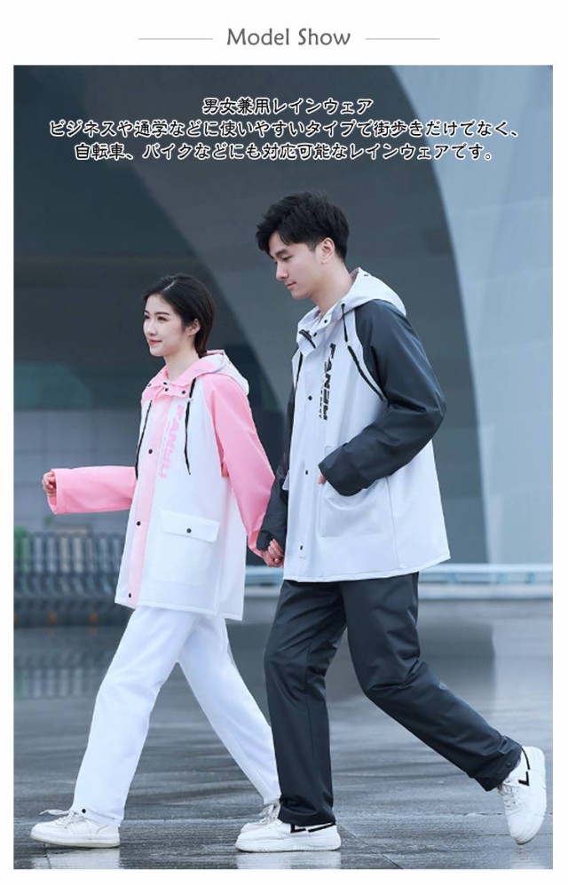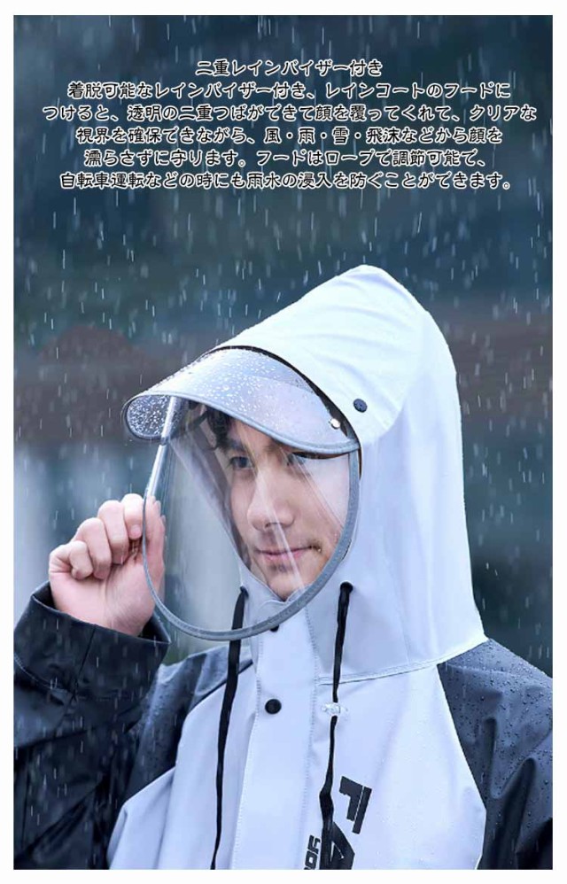 | レインウェア 上下セット 防水 防風 撥水 二重レインバイザー付き ●男女兼用レインウェア ビジネスや通学などに使いやすいタイプで街歩きだけでなく、自転車、バイクなどにも対応可能なレインウェアです。 革新的な収納式フードと着脱式バイザートップによって、雨の日の自転車運転も驚くほど安全・快適。レインウェアは上下とも、裏地全体にメッシュ素材を使用しており蒸れやベタつきを防止します!日常の通勤・通学・お出かけになどにピッタリの、街で暮らすすべての人に安全・快適を提供する一着です。 ●二重レインバイザー付き 着脱可能なレインバイザー付き、レインコートのフードにつけると、透明の二重つばができて顔を覆ってくれて、クリアな視界を確保できながら、風・雨・雪・飛沫などから顔を濡らさずに守ります。フードはロープで調節可能で、自転車運転などの時にも雨水の浸入を防ぐことができます。収納袋付き、旅行、出張、アウトドアにも楽々持ち運べて、自宅/事務室/車の中に常備すれば、急な雨にも心配はありません。 ●撥水・防水・耐久性高め 耐久性に優れたEVAエコ素材を採用し、防水力高め、丈夫で破れにくいレインウェアです。多重撥水加工を施され、水が生地の中に染み込むことなく弾けます。ファスナー+ボタンの二重設計により、ファスナーを閉じてボタンを留めることで雨水や風の侵入を防げ、大雨でも安心なレインコートです。 ●反射帯・ポケット付き 反射テープがあり、夜道や雨で視界が悪い時でも安心安全にご利用いただけます。ジャケット両サイドには大容量のフラップ付きポケットを配置し、利便性も確保しています。 | |