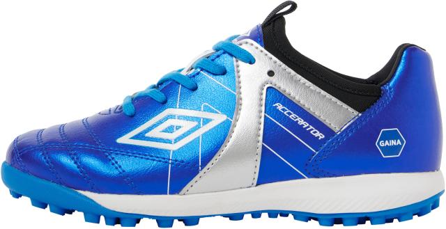 『ACCERATOR』シリーズのスターター/ステップアッププレーヤー向けシューズ。日本国内企画のワイドラスト。アンブロが持つフィッティングサポートファンクションのAフレームをグラフィックデザインで表現。インステップキック時のインパクトを意識しやすいプリント加工を採用。104本のラバースタッドでグリップし、屈曲性を考慮したアウトソールを採用。Aフレームパーツを採用。アッパー材全体に耐久性のある合成皮革を採用。クッション性と反発性を考慮したインジェクションEVAをミッドソールに採用。遮熱塗装材のGAINAをシューズ中底に搭載することで外部からの足裏への熱伝導を減らし、足裏のトラブルを軽減。取り外し可能なEVAカップインソ