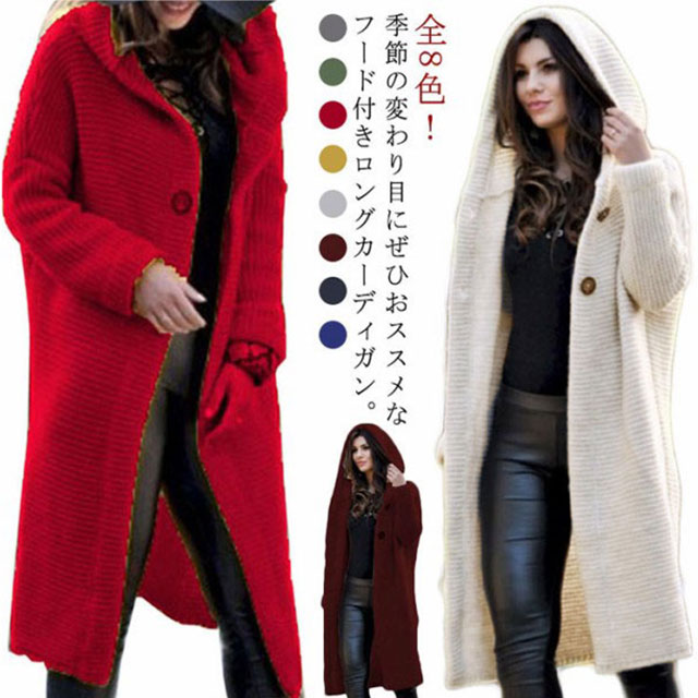 カーディガン ざっくり編み フード付きロングカーディガン ロング ニットコート ボタン開き セーター コーディガン 厚手 ゆったり ざっくり 大人可愛い 秋冬