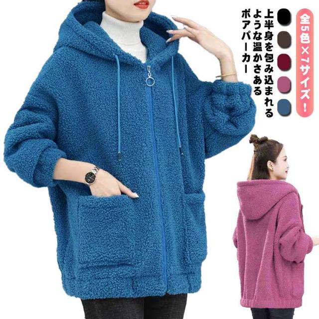 ボアパーカー シンプル ボアコート レディース パーカー ロングパーカー フード付き ジップアップパーカー アウター もこふわ 秋冬 大きサイズ 無地 カジュアル ゆったり もこもこ