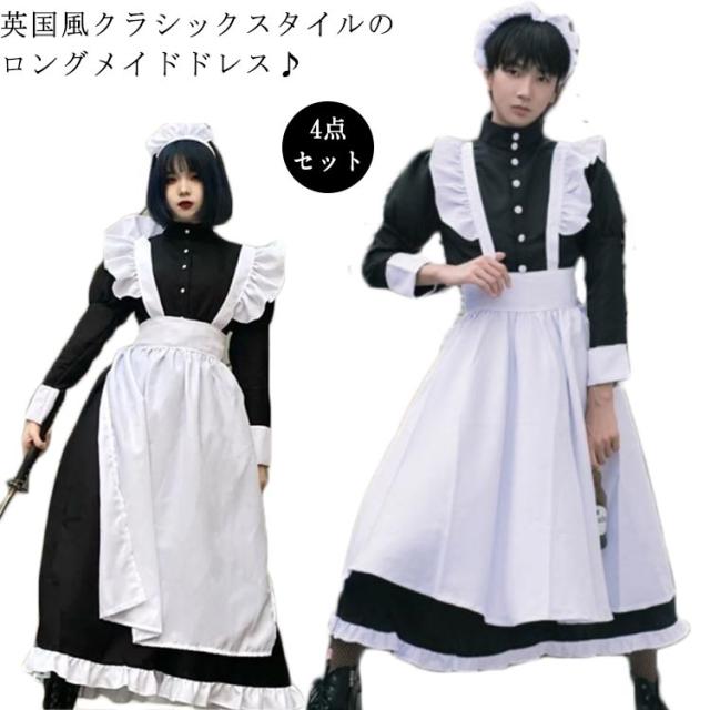 女装 仮装 メイド服 コスプレ フリル ロング丈 コスチューム ロリータ かわいい 長袖 黒 レディース セット 衣装 カフェ イベント 学園祭 文化祭 こすぷれ 大きいサイズ S-3 定番
