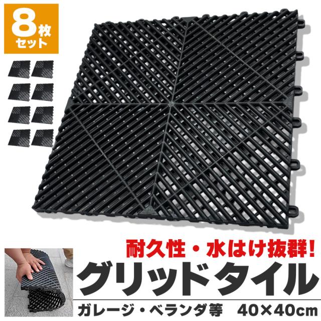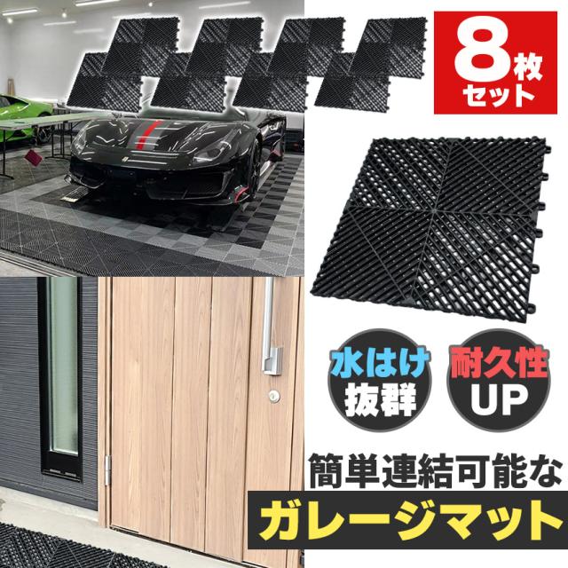 8個セットガレージマット ガレージタイル ガーデンタイル グリッドマット グリッドタイル タイル 黒 1.8cm厚 駐車場 ガレージ ベランダ バルコニー プールサイド 40x40cm 耐荷重 樹脂製 水はけ 連結式 DIY床材 スリップ防止 足場の安定 洗える