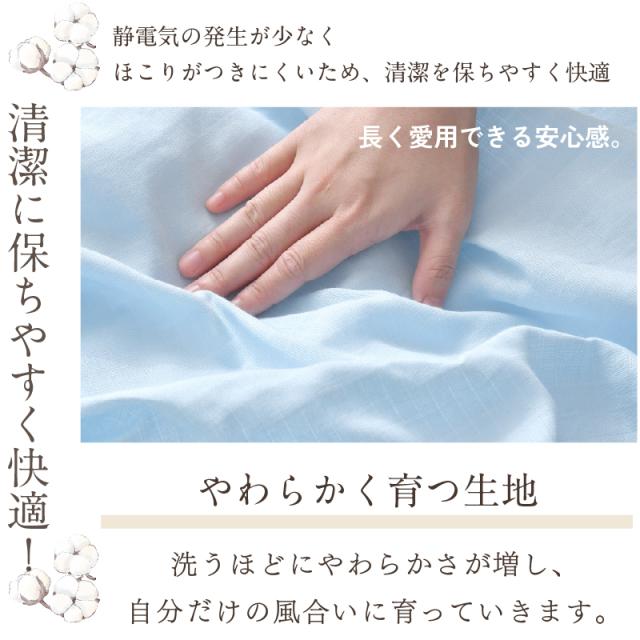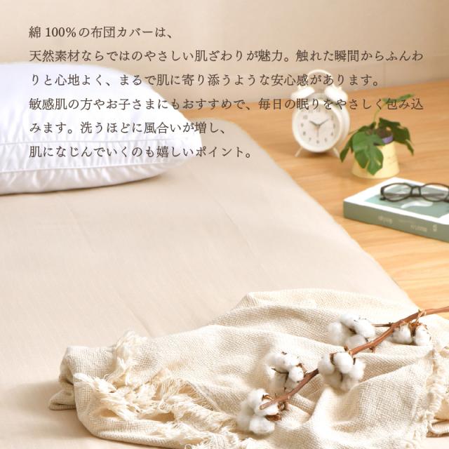 綿100%の布団カバーは、天然素材ならではのやさしい肌ざわりが魅力。触れた瞬間からふんわりと心地よく、まるで肌に寄り添うような安心感があります。敏感肌の方やお子さまにもおすすめで、洗うほどに風合いが増し、肌になじんでいくのも嬉しいポイント。