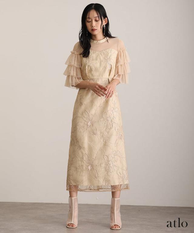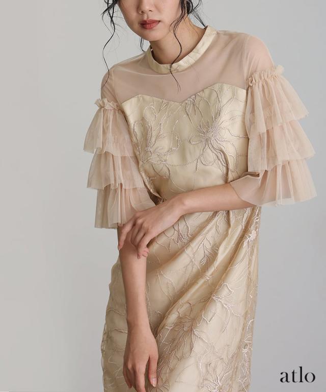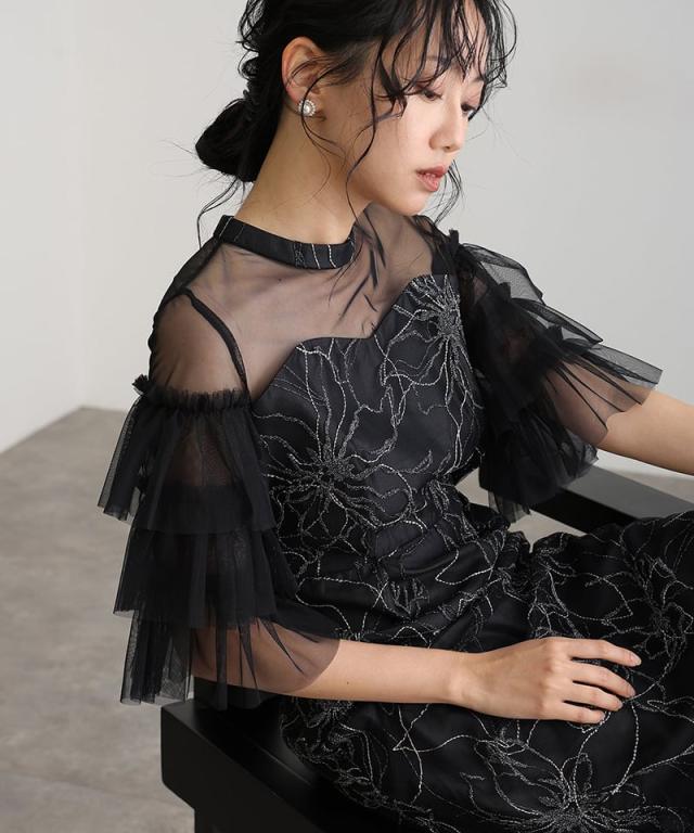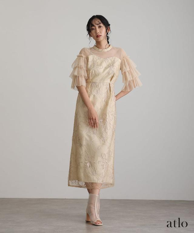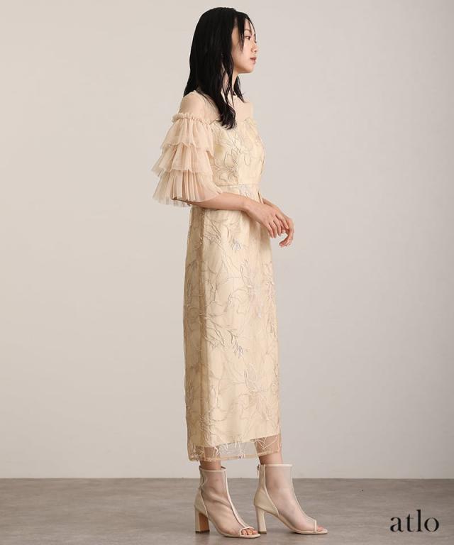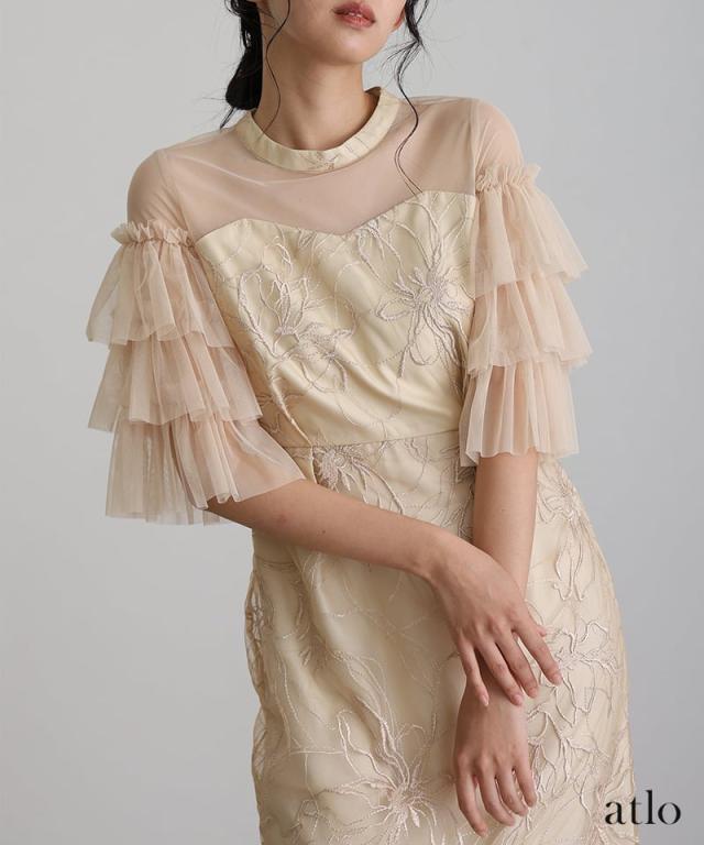 繊細なチュール素材に立体感のあるフラワー刺繍を施した、Iラインドレス。