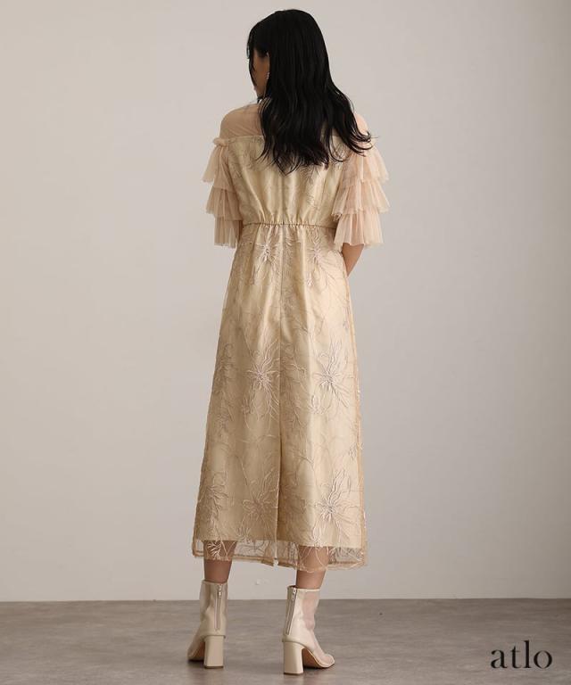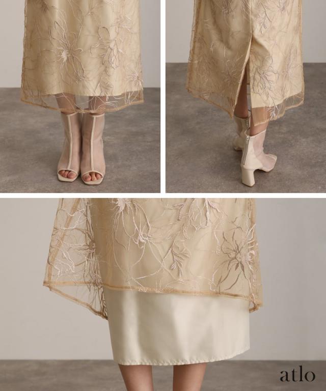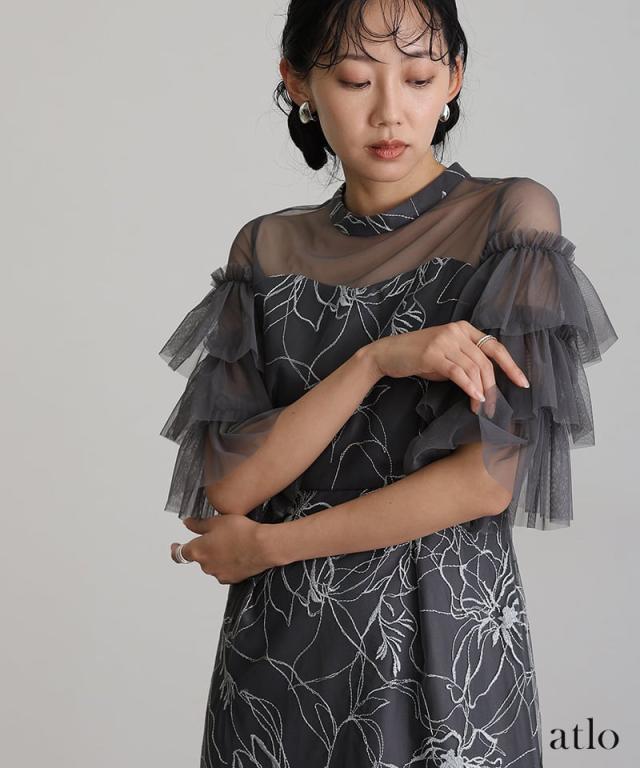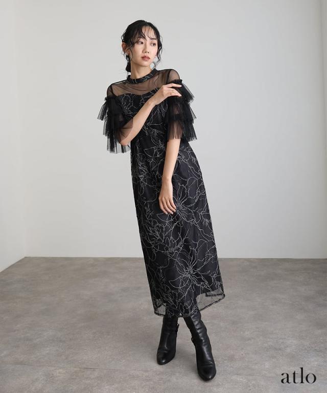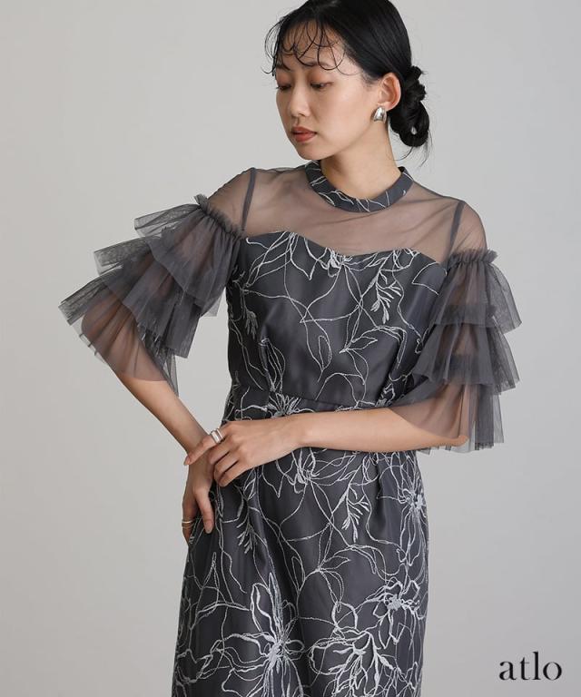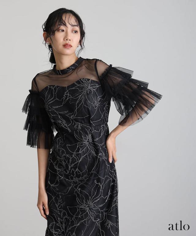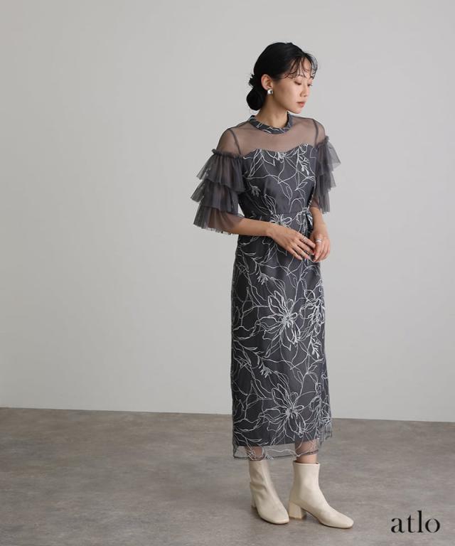 繊細なチュール素材に立体感のあるフラワー刺繍を施した、Iラインドレス。