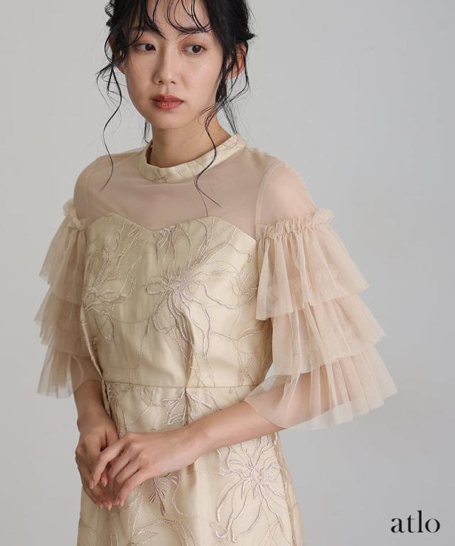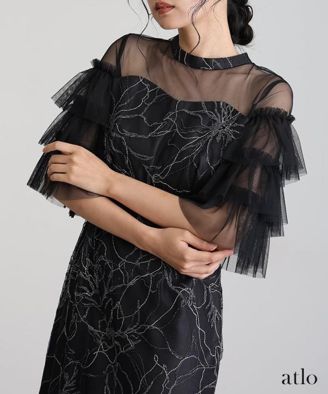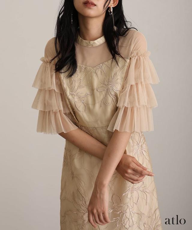 肩から袖にかけてあしらわれたティアードフリルがエレガントな華やかさをプラスし、