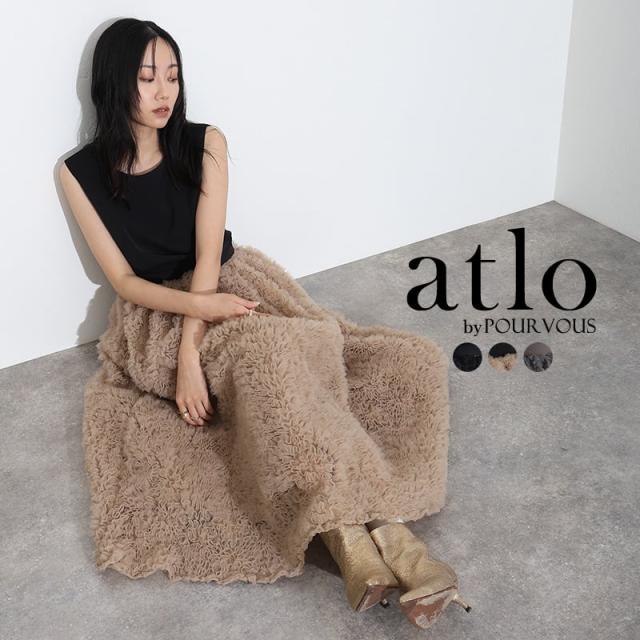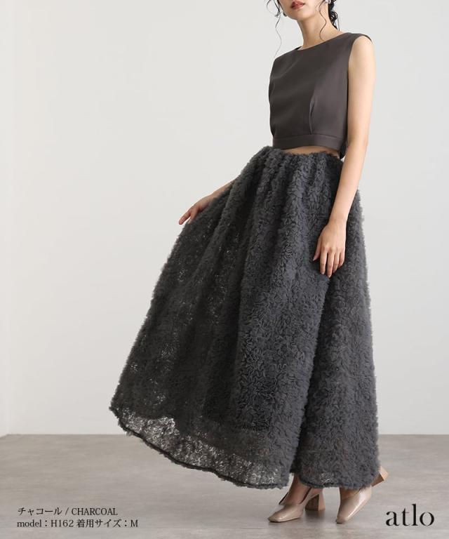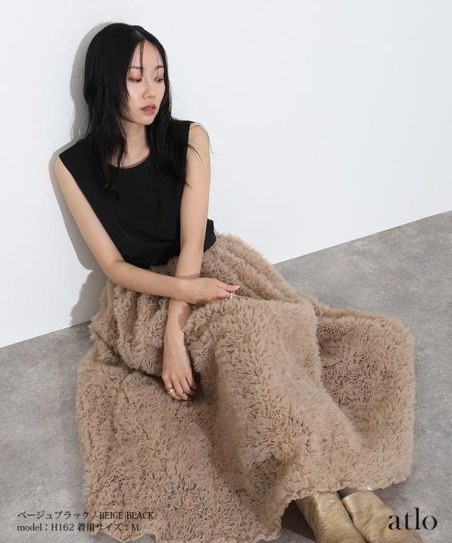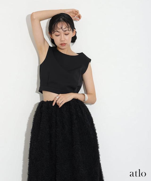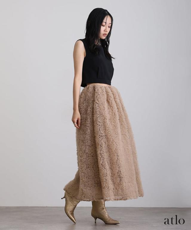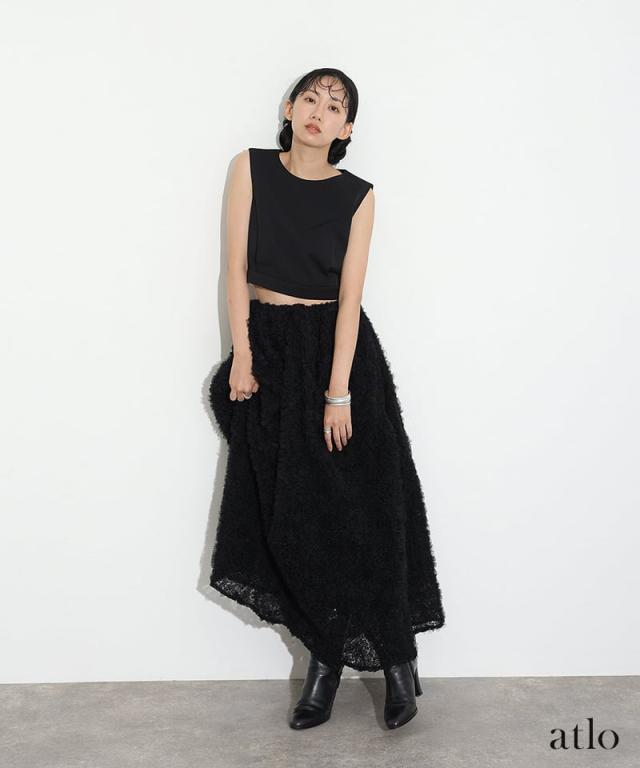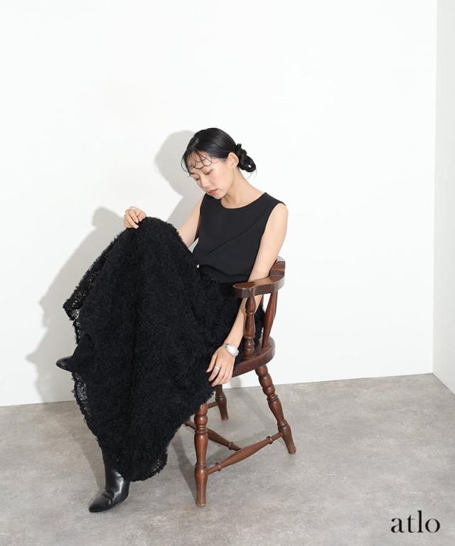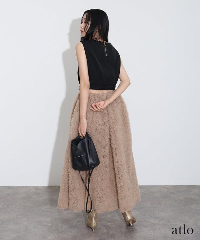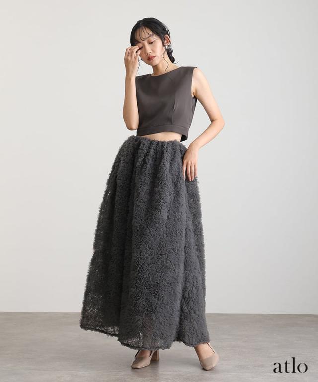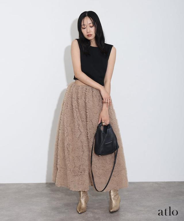 スカートがひき立つよう、トップスはセミマット・少し落ち感のある素材で、
