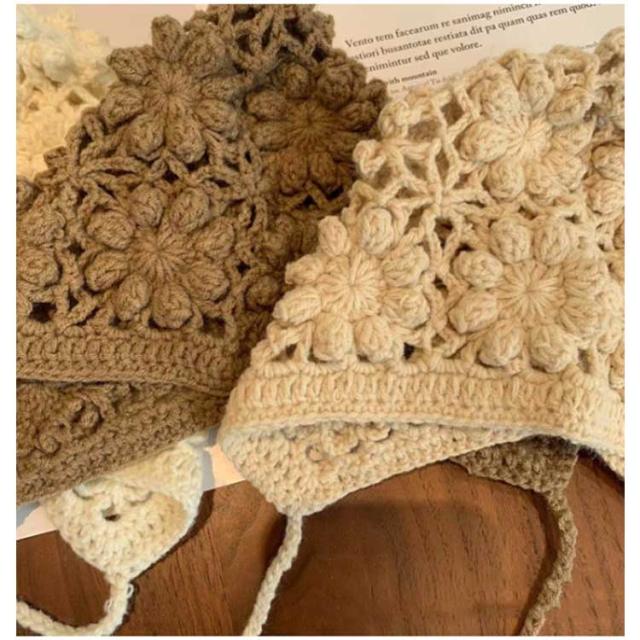 | 透け編みがとっても可愛いフラワーニットボンネット。透かし編みがおしゃれです。 お花模様の透かし編み ボンネット。ざっくりと編まれたお花模様がおしゃれなボンネットです。 ひもの先にもお花のモチーフ付がついてます。頭をすっぽり包みこむシルエットがかわいい帽子です。 退院着・お宮参り・アニバーサリーの時にもおすすめアイテムです。 出産祝いや誕生日プレゼントにもおすすめ! ユニセックスデザイン!男の子でも女の子 でも似合う! 色んな小物やお洋服と合わせてみてね! | |