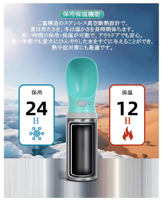 | 【ステンレス素材】ペットウォーターボトルは食品グレードのステンレス製。安全かつ環境配慮設計で、犬・猫の健康を守る給水器です。 【保冷保温機能】 二重構造のステンレス真空断熱設計で、夏は冷たさを、冬は温かさを長時間保ちます。長い時間の保冷・保温が可能で、アウトドアでも安心。暑い季節でも愛犬にひんやりした水をすぐに与えることができ、熱中症対策にも最適です。 【大容量】400mllの大容量ペットボトルで、小型犬のこまめな水分補給から、大型犬や多頭飼いのたっぷり給水まで幅広く対応。夏のお散歩でも余裕の容量設計で、1本で外出を快適にサポートします。 【片手操作&完全防漏】ワンタッチ出水ボタン搭載。ロック機能付きペットウォーターボトルでバッグ内漏水ゼロ、アウトドアでも安心です。お散歩や旅行、ハイキングなど、長時間の外出でも安心のサイズです。 | |