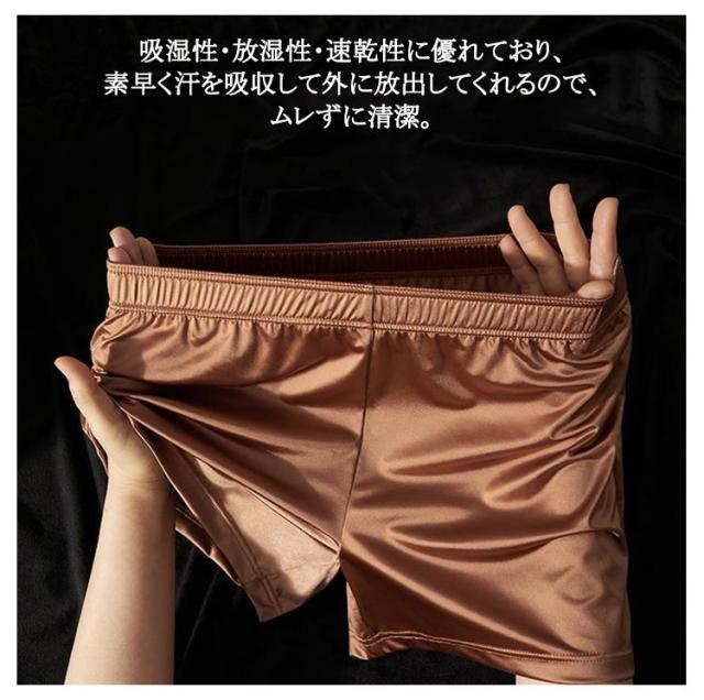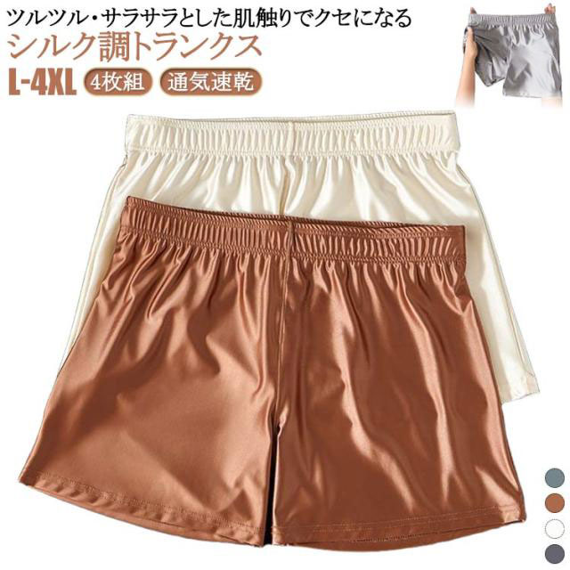 | 4枚組!ツルツル・サラサラとした肌触りでクセになるシルク調トランクス。 接触冷感でひんやり快適な着心地。 シルク調生地の光沢が美しく、 すべすべとした滑らかな肌触りが一度履いたらやめられないほど。 吸湿性・放湿性・速乾性に優れており、 素早く汗を吸収して外に放出してくれるので、ムレずに清潔。 | |