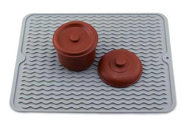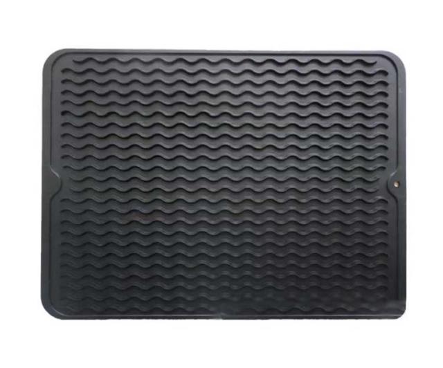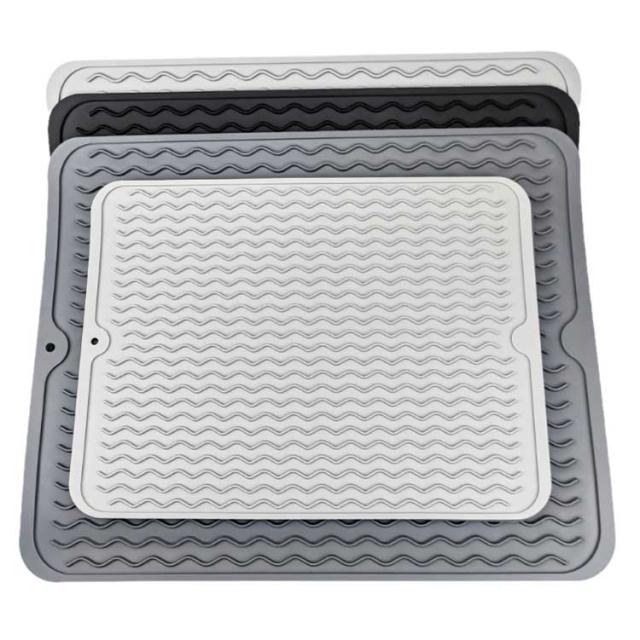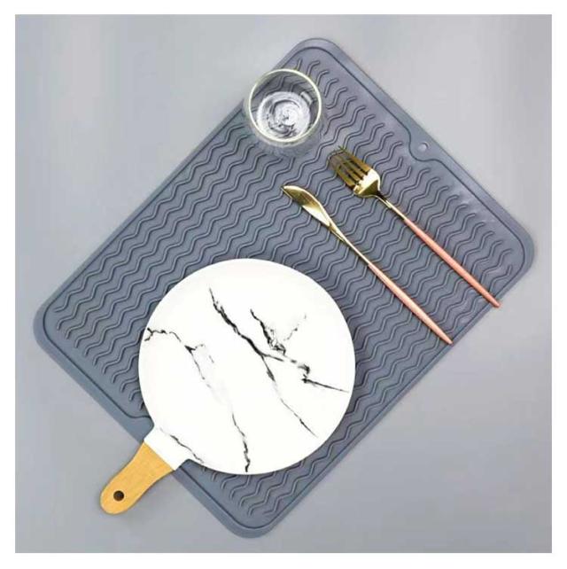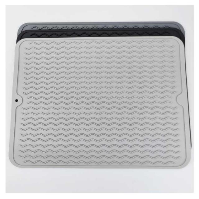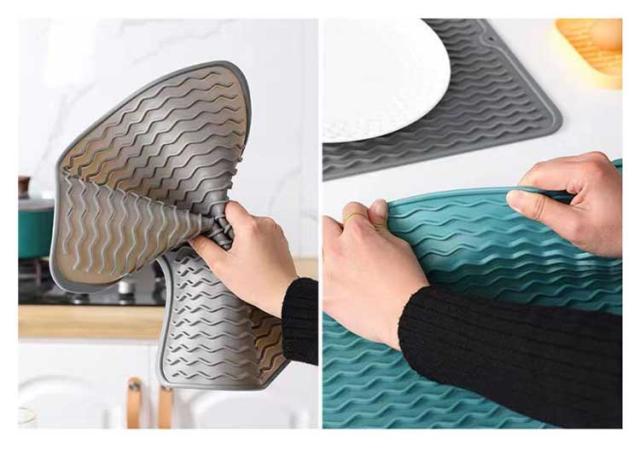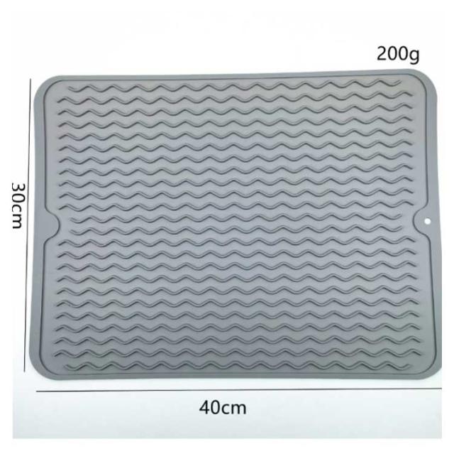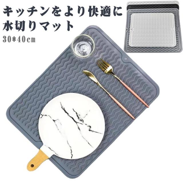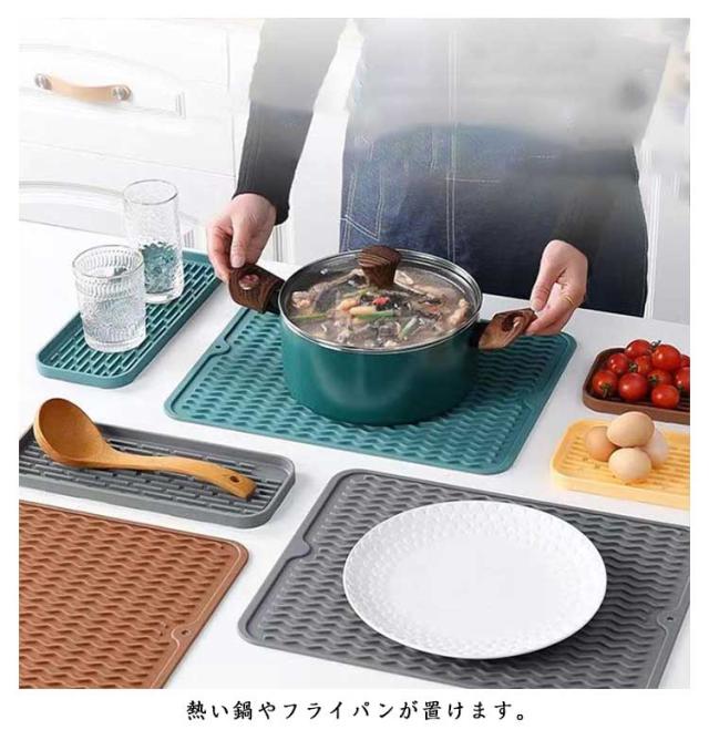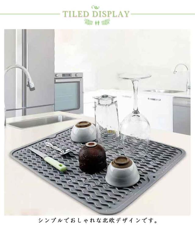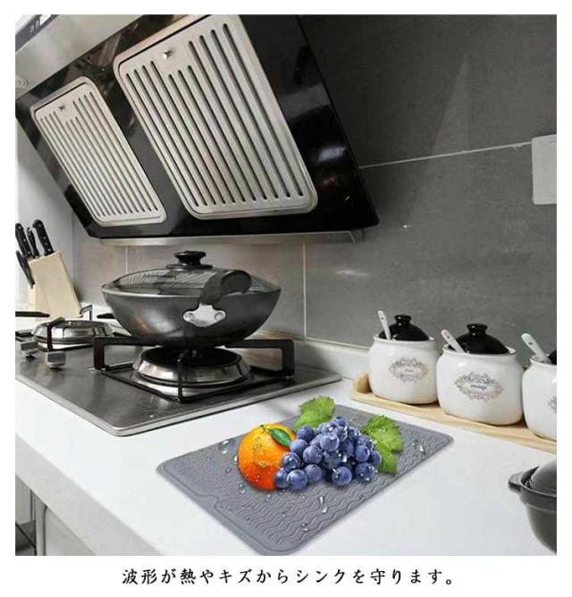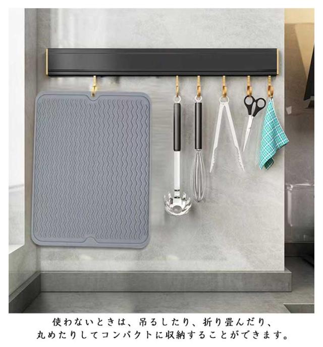| キッチンをより快適に水切りマット。30*40cm シンプルでおしゃれな北欧デザインです。 使わないときは、吊るしたり、折り畳んだり、丸めたりしてコンパクトに収納することができます。 波形が熱やキズからシンクを守ります。 熱い鍋やフライパンが置けます。 | |