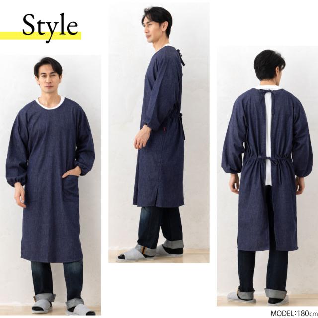 ソフトデニム生地のシンプルなメンズ用割烹着。広範囲を汚れから守ってくれる、ロング丈タイプです。柔らかな生地感は動きやすく、大きめに作られているのでゆったりと着て頂けます。