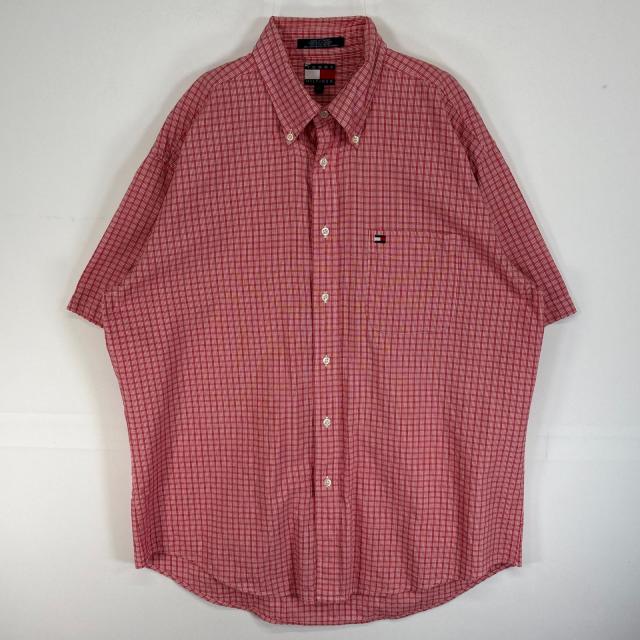 古着 90s/90年代 トミーヒルフィガー TOMMY HILFIGER 半袖シャツ ロゴ 刺繍 胸ポケ ボタンダウン L レッド系 チェック メンズ
