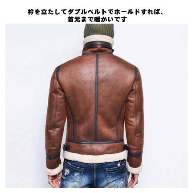 | ボディのリアルに再現したフェイクムートンの質感は肌触りが良く高級感満点。 裏地には毛足の短いボアを 身頃はもちろん袖先にまで施しており、防寒性もバツグンです! 本革よりも扱いやすい分、気軽に着用いただけます。 レザーと違い軽量なところも人気の1つです。 衿を立たしてダブルベルトでホールドすれば、首元まで暖かいです。 | |