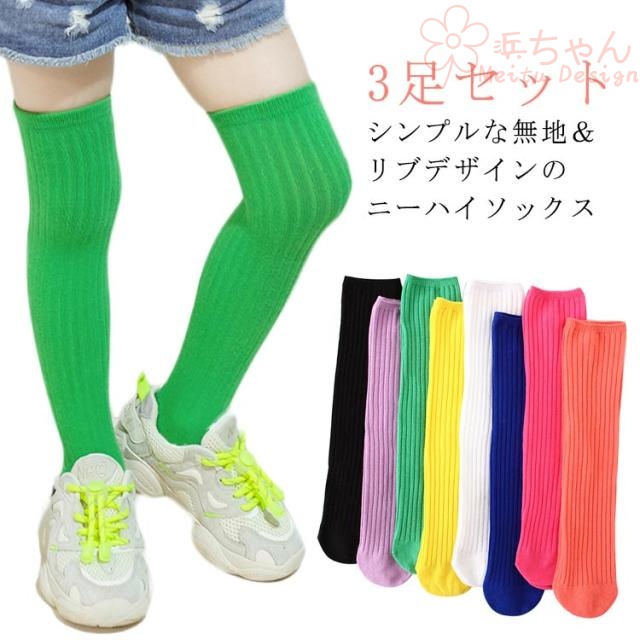 キッズ ニーハイ 3足セット ソックス 幼稚園 ニーハイソックス ハイソックス スクールソックス 小学生 リブソックス リブ 黒 3-12歳用/長44cm 保育園 靴下 子供 女の子 かわいい 無地 ブラック ファッション 送料無料 膝上ソックス