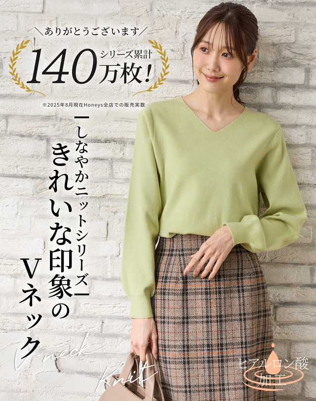 トップス ニット セーター 長袖 大きいサイズ ヒアルロン酸加工 Vネック ボリューム袖 しなやかニット 無地 レディース SALE セール Honeys ハニーズ ヒアルロン酸Vネック