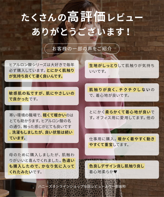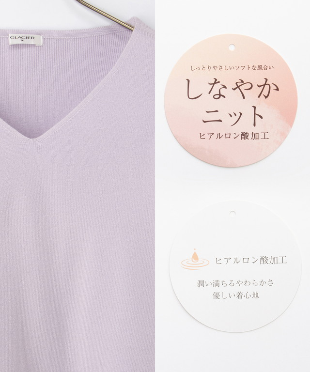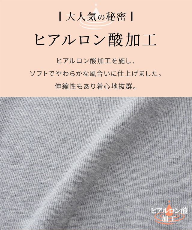 軽くてもちもちとした糸に『ヒアルロン酸加工』をプラスした、しっとりソフトな風合いの『しなやかニット』素材。