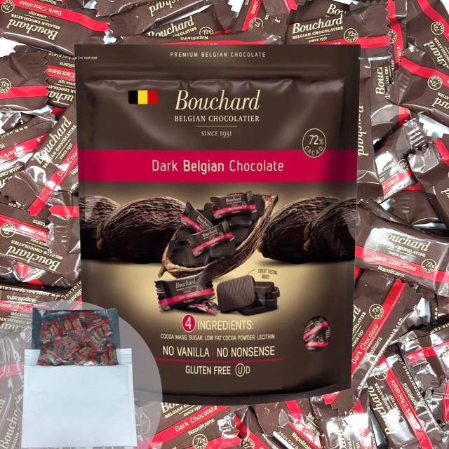 ・ブシャール・ナポリタンは、最高級の素材のみを使用し、ベルギー・ゲント市で製造される美味しいベルギー産ダークチョコレートです。一般的なミルクチョコレートバーと比較して、当社のダーク72%ナポリタンは糖分を最大50%削減しています。