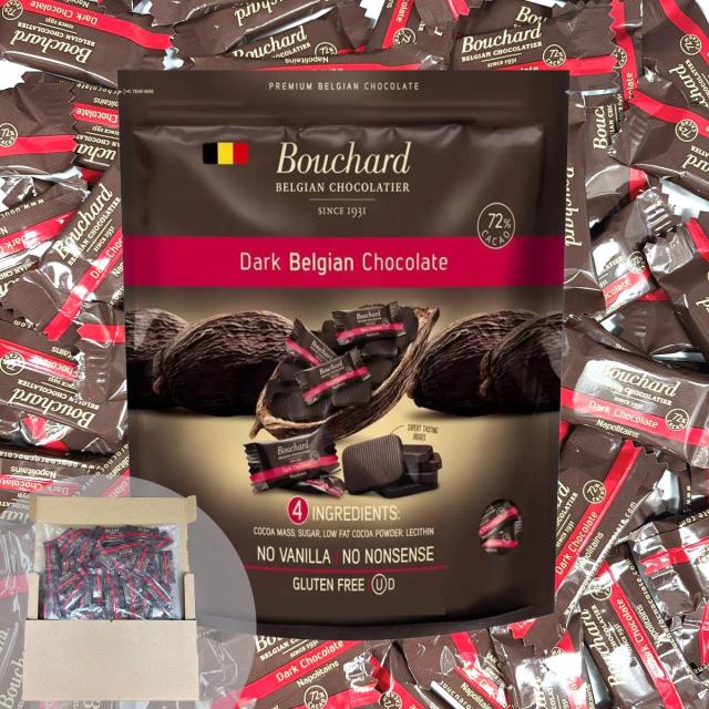 ・ブシャール・ナポリタンは、最高級の素材のみを使用し、ベルギー・ゲント市で製造される美味しいベルギー産ダークチョコレートです。一般的なミルクチョコレートバーと比較して、当社のダーク72%ナポリタンは糖分を最大50%削減しています。