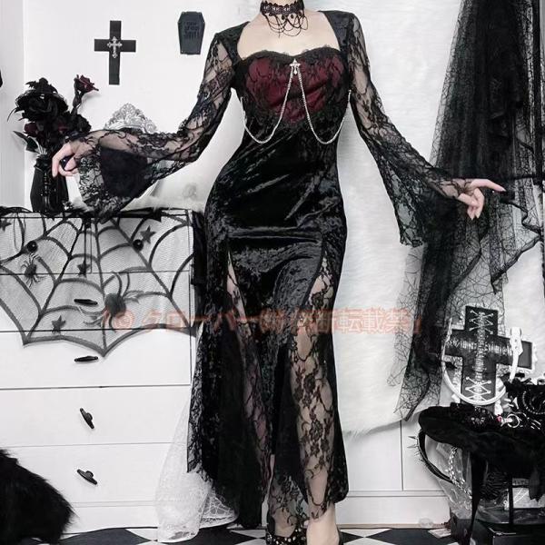 ワンピース レース ゴシック ドレス ロング ワンピ 長袖 クローバー株式会社 スリット フィッシュテール セクシー レディース ベルベット ダーク ロザリオ ゴスロリ系