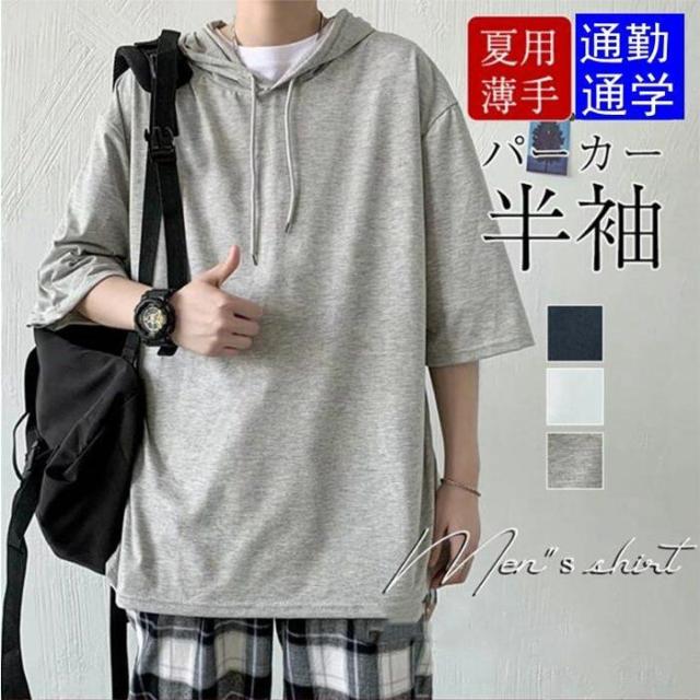 パーカー 半袖 Tシャツ メンズ 夏用 薄手 パーカー 5分袖 カジュアル 夏パーカー フード付き 肩落ち かっこいい おしゃれ