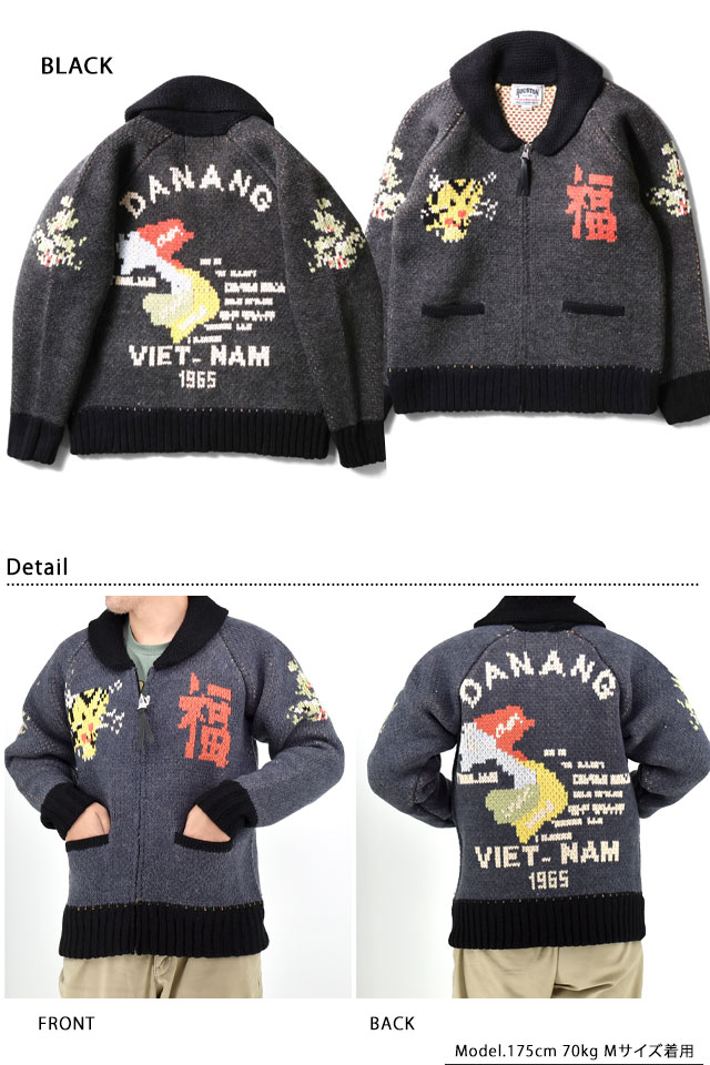 HOUSTONが得意とするスカジャンを、カウチンニットに落とし込んだカーディガンです。
