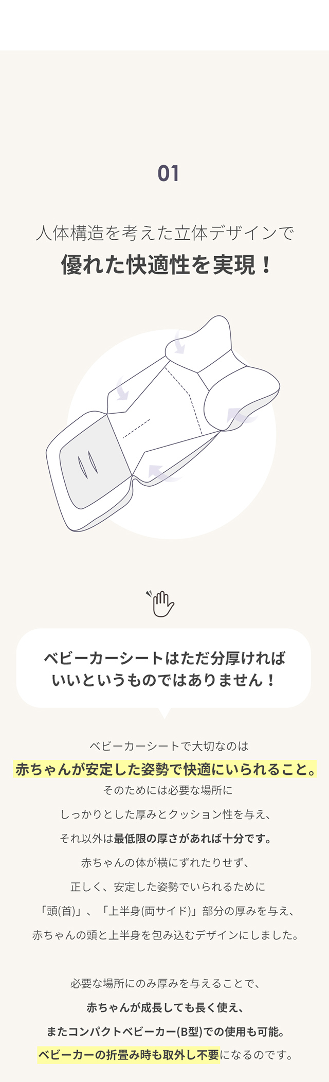 赤ちゃんの体に沿ってシートの厚みを変えた人体工学的デザインの立体構造だから、