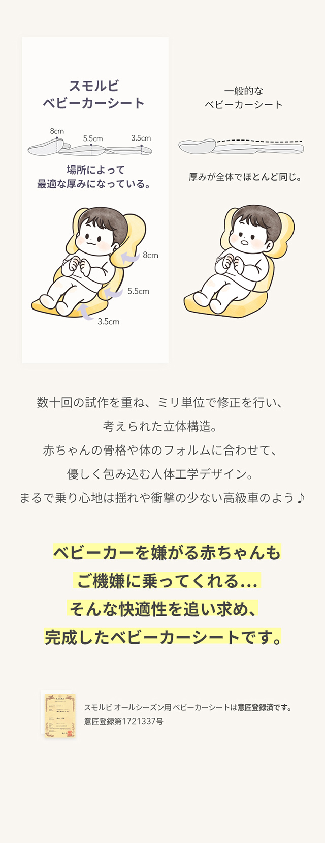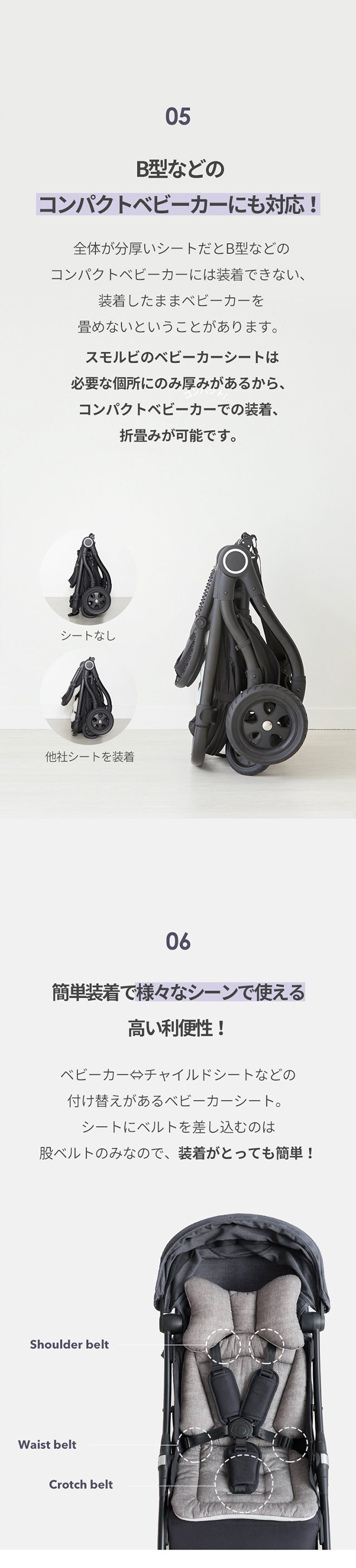 スモルビのベビーカーシートは必要な個所にしっかりと厚みを与え、必要でない箇所には最低限の厚みを作ることで 快適な乗り心地を保ちながら、B型などのコンパクトベビーカーでも使用可能ですし、装着したままの折畳みも可能にしました。 また赤ちゃんが大きくなっても窮屈になったりしません。 ベビーカーを卒業する日まで長く使えるベビーカーシート、それがスモルビのベビーカーシートです。