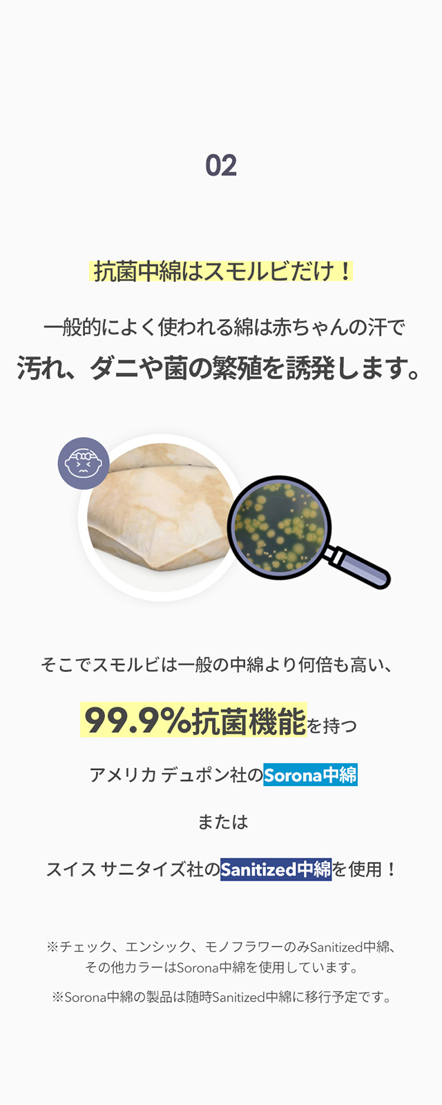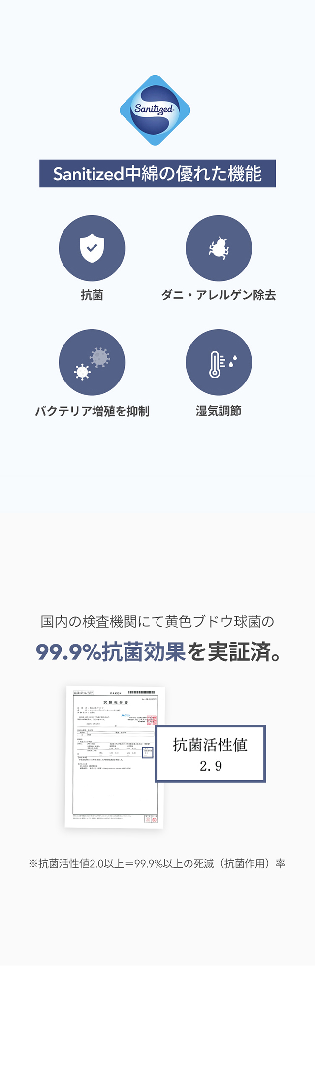 アメリカ デュポン社の99.9%抗菌ソロナ綿を中綿に使用しているので、半永久的に抗菌が持続します。