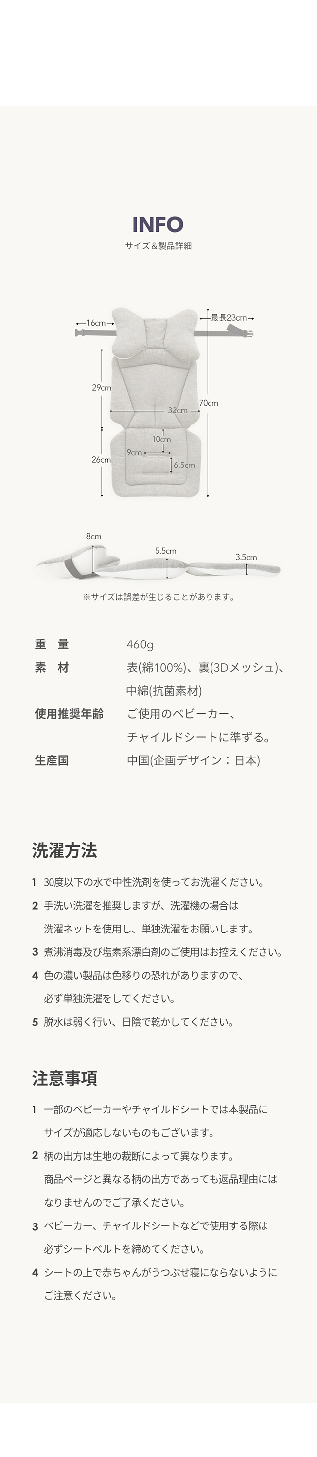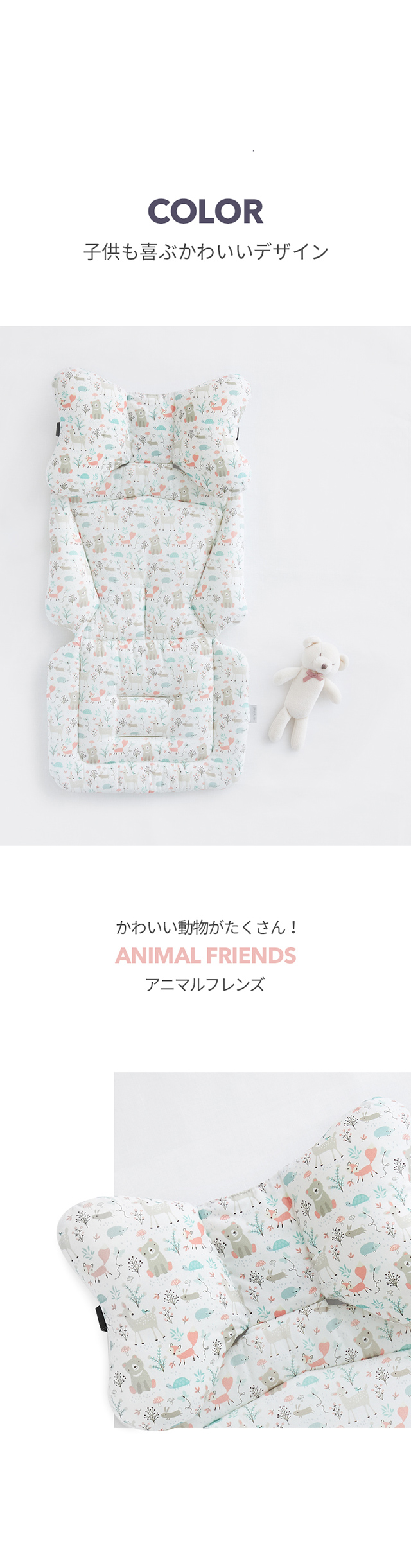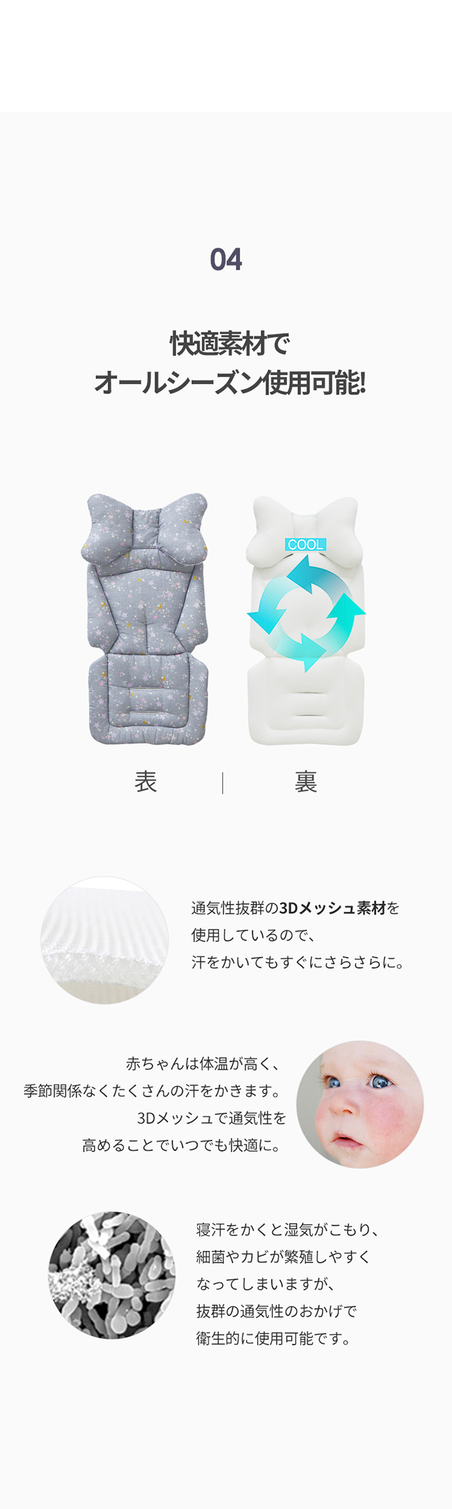表地は綿、裏は3Dメッシュなので通気性に優れ、夏場は3Dメッシュの面を表にして使用することも可能です。 またシートがずれるのを防止する機能として2カ所の固定箇所を設けているのでずれも最小限に抑えられます。