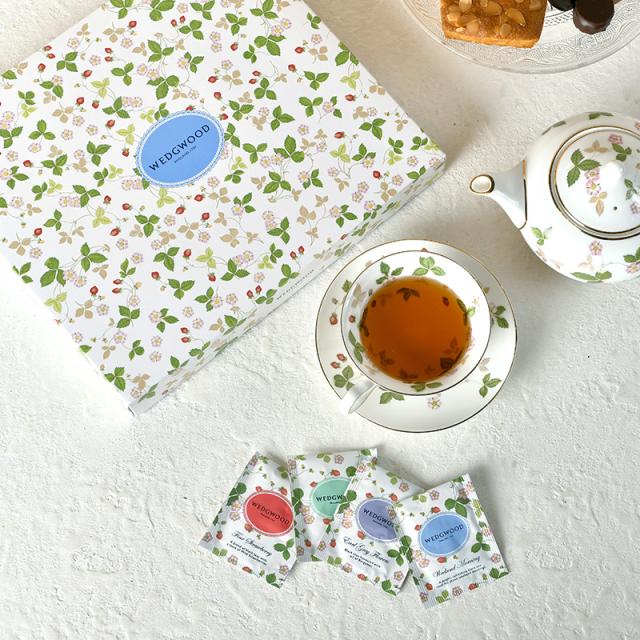 ギフトにおすすめ。ウェッジウッドの代名詞、ワイルドストロベリー柄のティーバッグ4種を堪能できるセット。