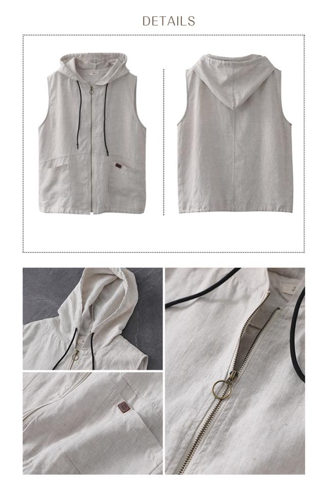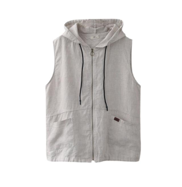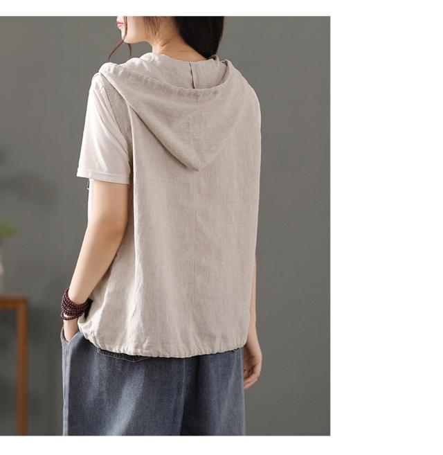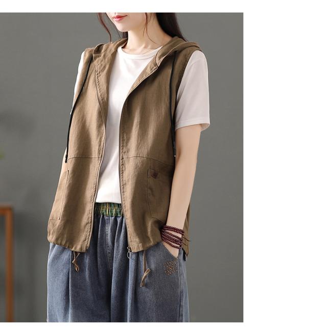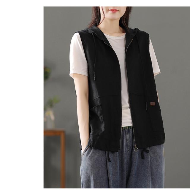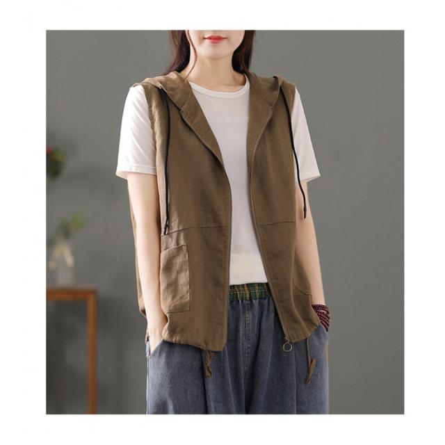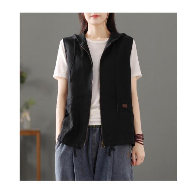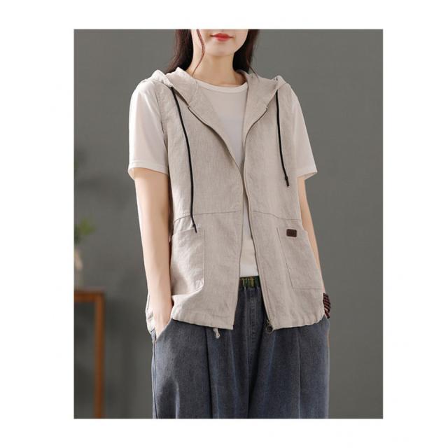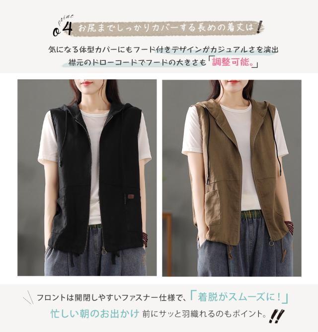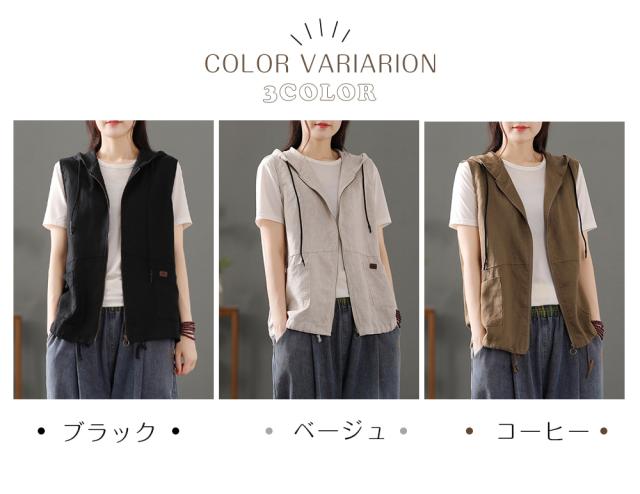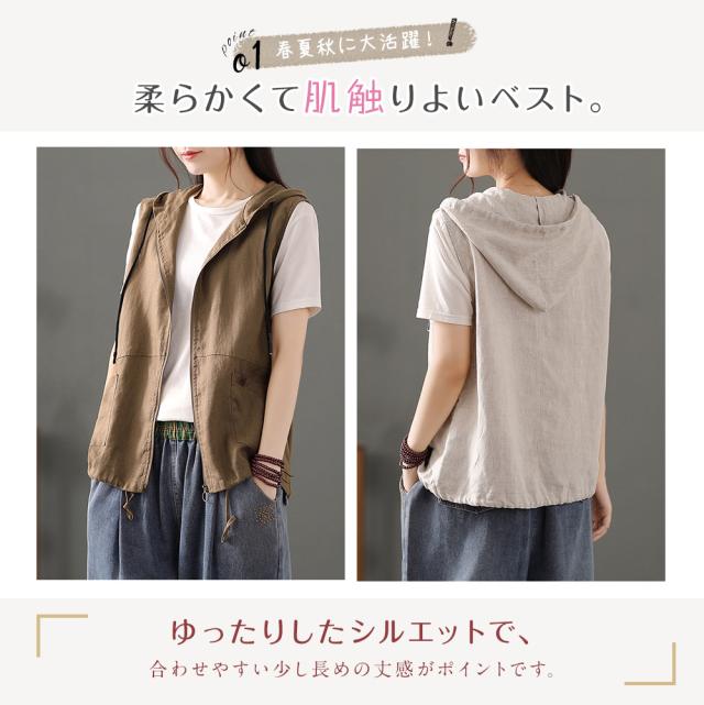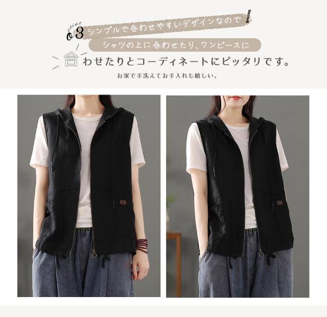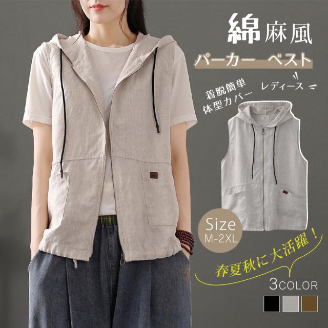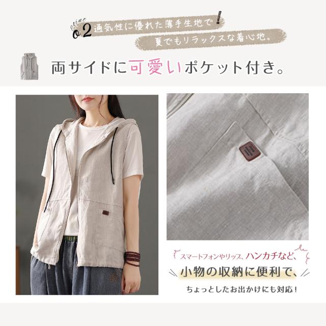 綿麻ベスト レディース フード付きベスト パーカー ベスト サマーベスト ジレベスト ポケット付き 綿 麻 ベスト ノースリーブパーカー チョッキ 袖なし 前開き ノースリーブ ゆったり 大きいサイズ 無地 薄手 体型カバー 夏 通勤