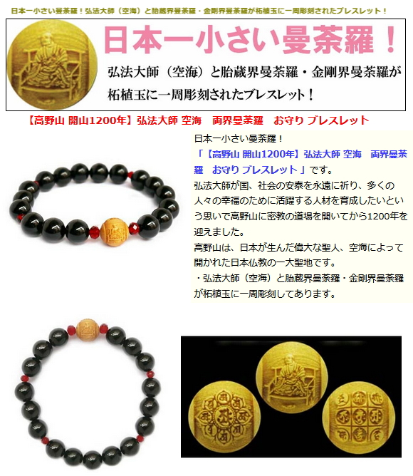 精緻な柘植彫刻!日本一小さい曼荼羅。高野山、開山1200年!弘法大師(空海)と胎蔵界曼荼羅・金剛界曼荼羅が柘植玉に一周彫刻されたブレスレット。弘法大師が国、社会の安泰を永遠に祈り、多くの人々の幸福の ために活躍する人材を育成したいという思いで高野山に密教の道場を開いてから1200年を迎えました。高野山は、日本が生んだ偉大な聖人、空海によって開かれた日本仏教の一大聖地です。弘法大師(空海)と胎蔵界曼荼羅・金剛界曼荼羅が柘植玉に一周彫刻してあります。